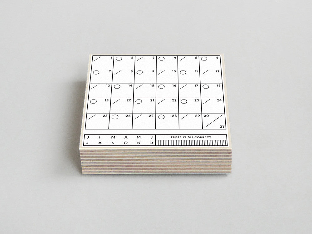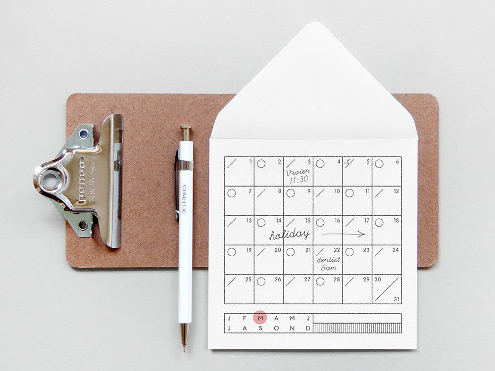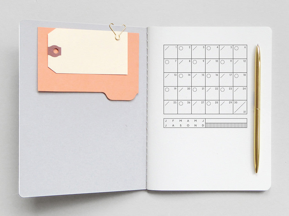 Print a calendar any day of the year with our new planner stamp. The perpetual grid allows you to mark up dates, with space to write in basic details & a month marker at the bottom (we highlighted with a translucent sticker).