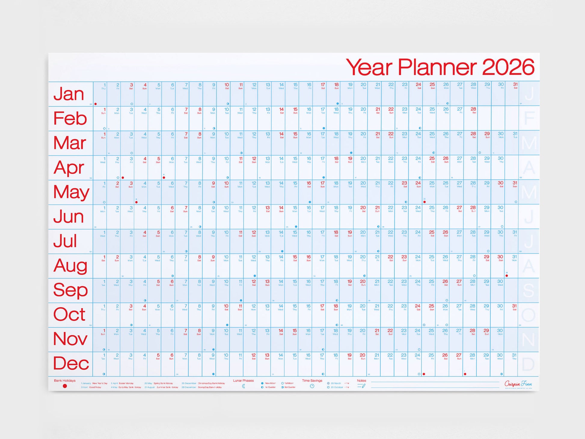 Back for its 12th (!) year at P&C, the perfect 2026 wall planner from Crispin Finn. Printed in blue and red, folded and packaged in a screen printed wallet. It measures a whopping 945x655mm and has plenty of space for you best laid plans.