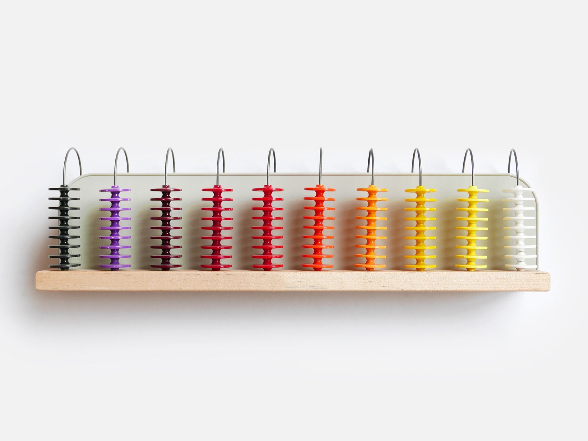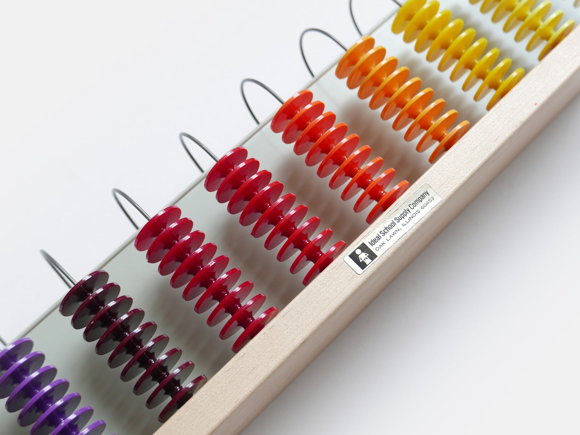 A large desk abacus constructed of a perfect gradient of yellow, orange, reds, through to a dark purple. The unit is in excellent condition and comes with the original box. It measures 51cm in diameter, and 16cm in height.