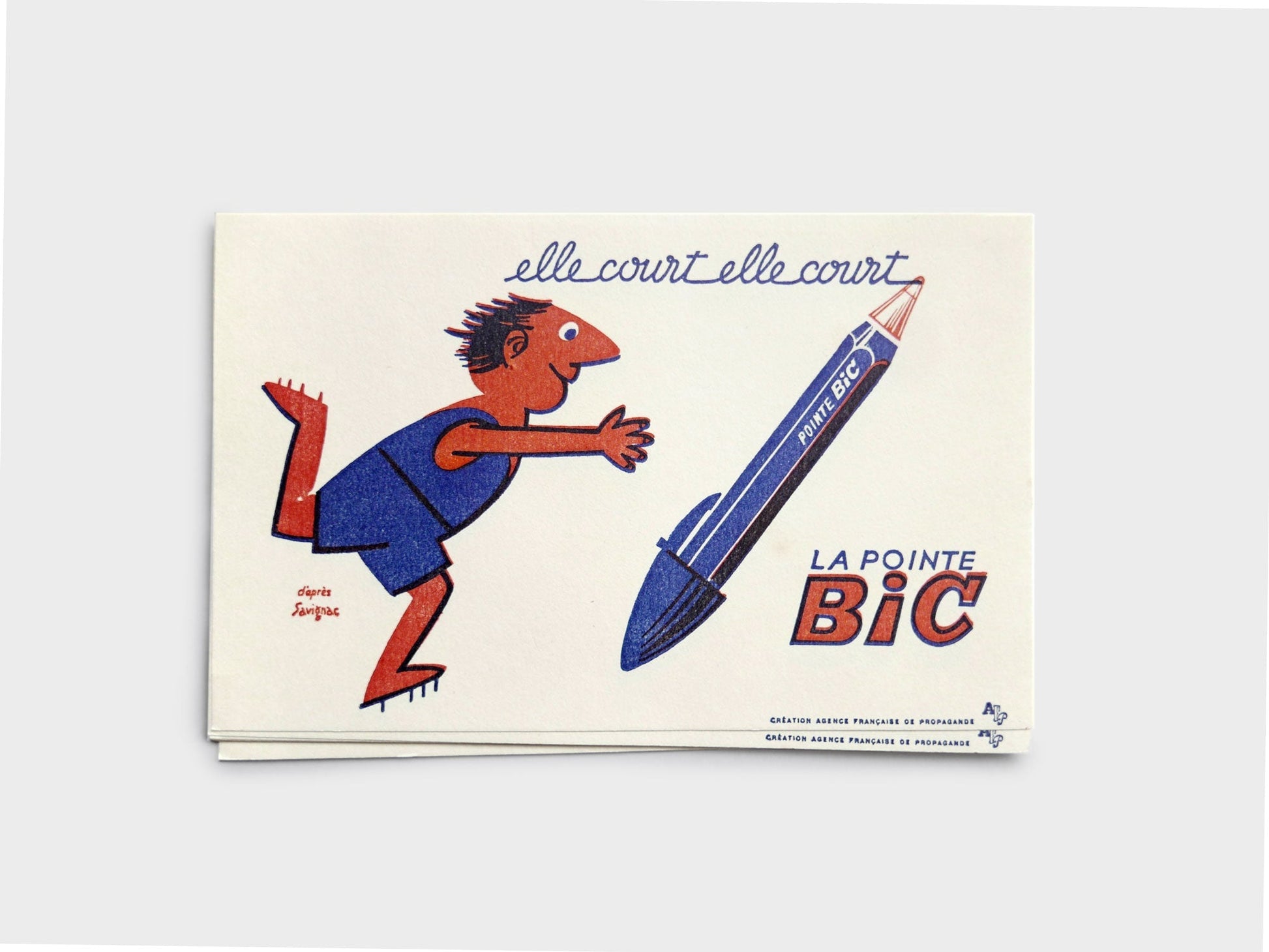 An original promotional blotter from France, featuring a great illustration of a man chasing a pen. Great in a frame. It measures 210x135mm