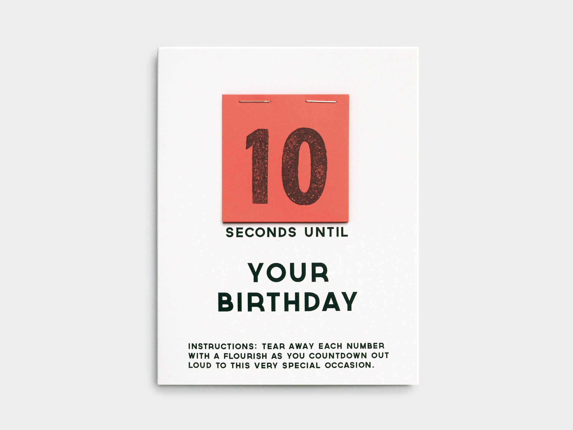 Countdown to a birthday with this fun card featuring 10 tear off numbers. An interactive greeting which must end with a cheer.