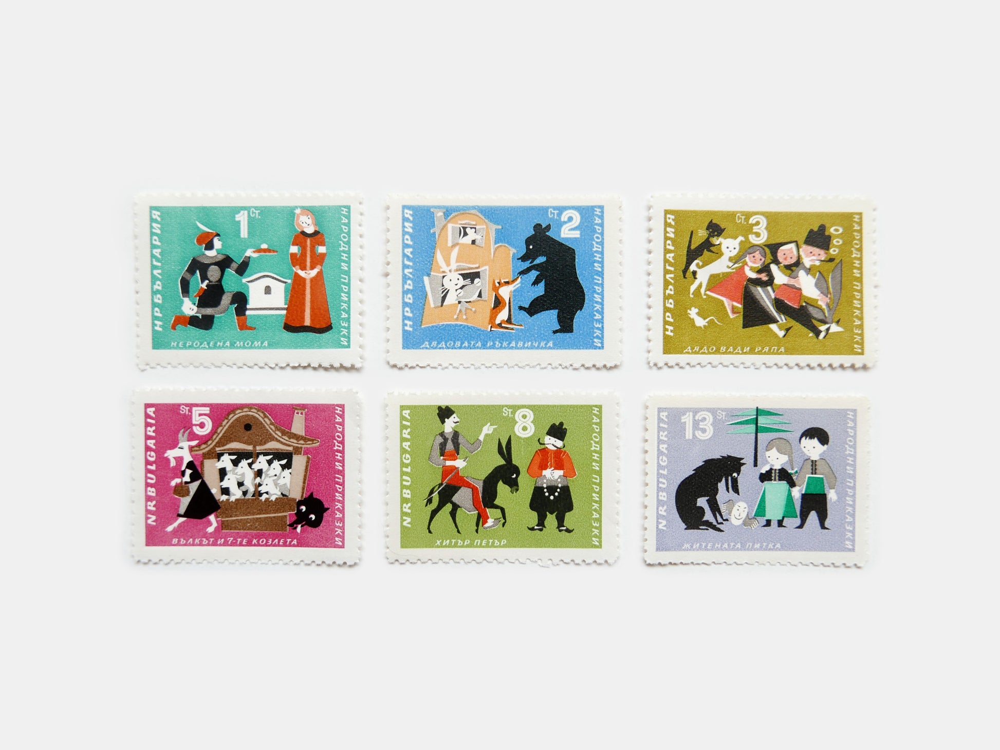 Celebrating traditional folk tales these stamps, issued 1964, are charmingly illustrated with great colours. We love the bear the most. For your collection, or your wall, they are in mint condition. Illustrated by the legendary Stefan Kanchev.