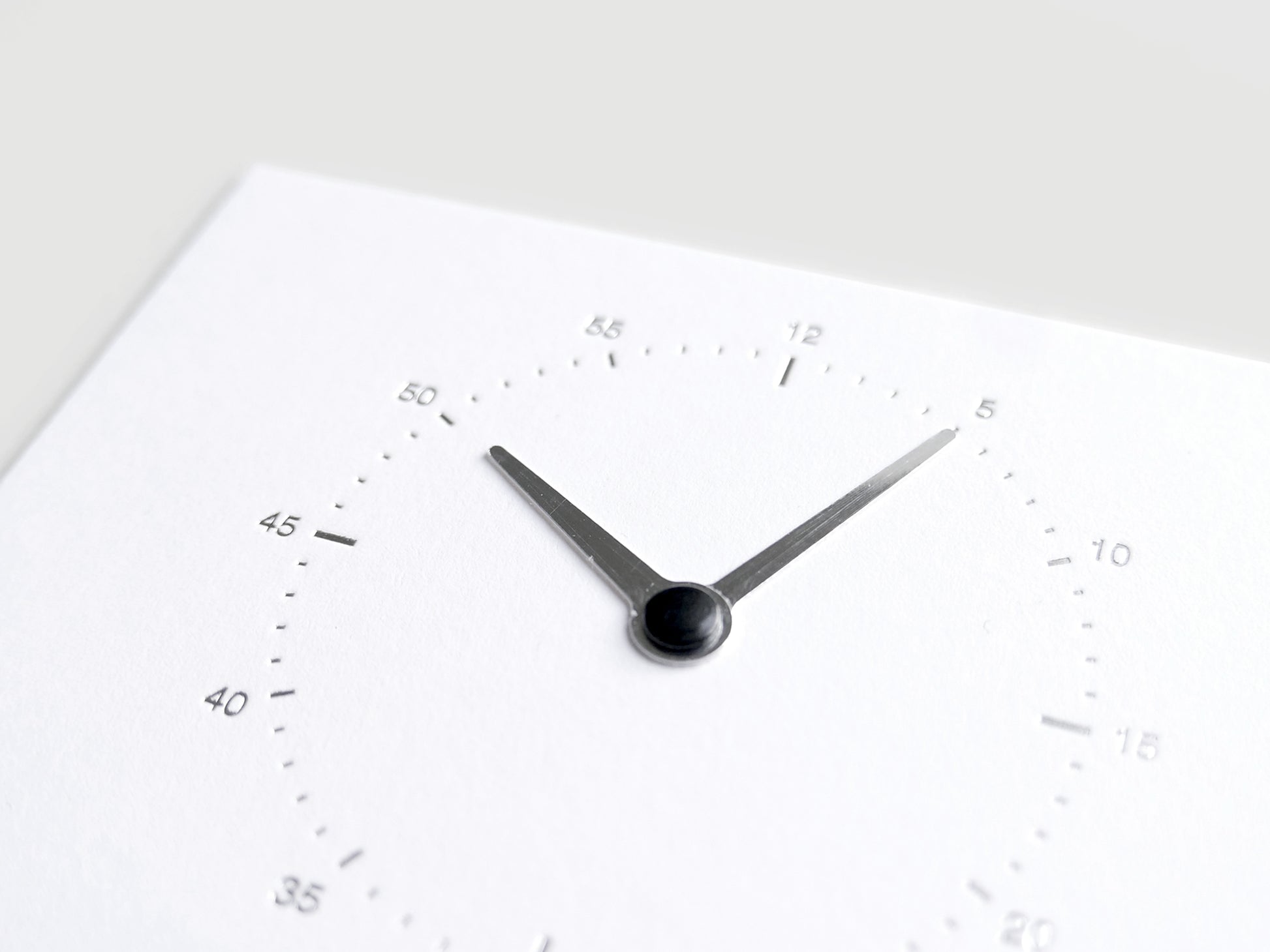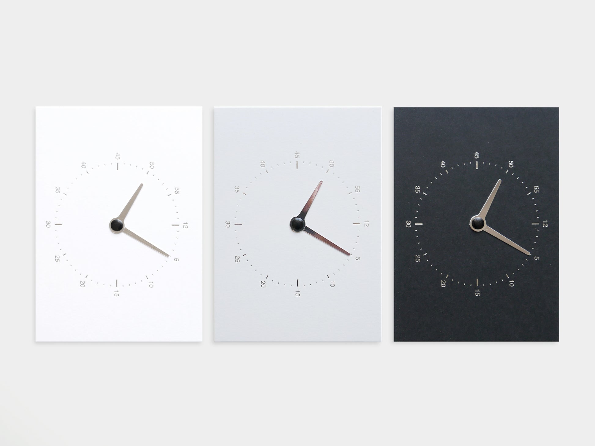 Handy postcards featuring movable silver hands, against a crisp foiled clock face. The card measures 210x148 and the card stock is thick and uncoated. Each one comes with a cream envelope.