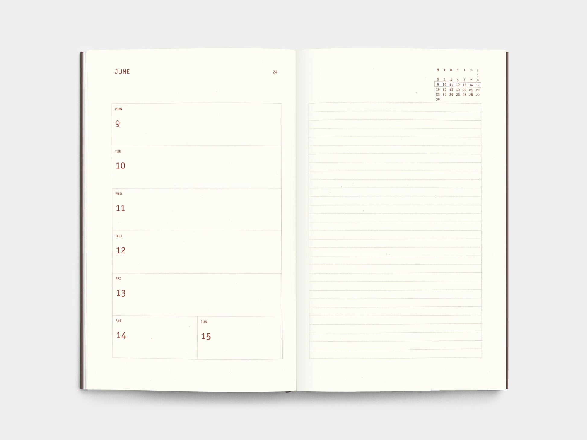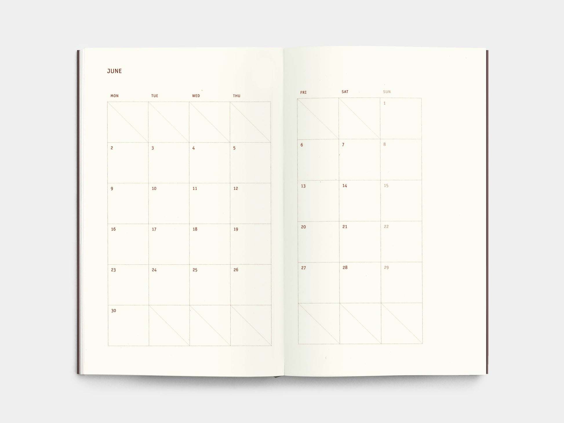 A diary of super smooth, off white, week to view pages which is bound in a flat lay, uncoated cover. The diary also has space for notes & each month opens with an overview.
