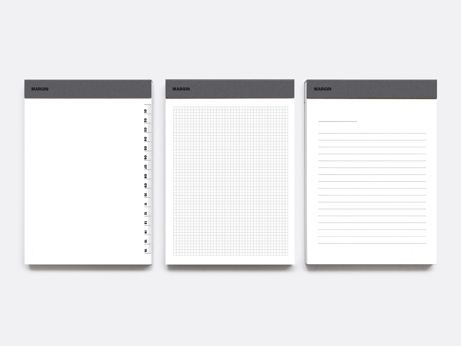 Solid, simple paper pads in three different formats. 100 pages, bound with board, printed with a ruler, a grid or lines. The pad measures 200x140mm and each page is perforated for easy removal.