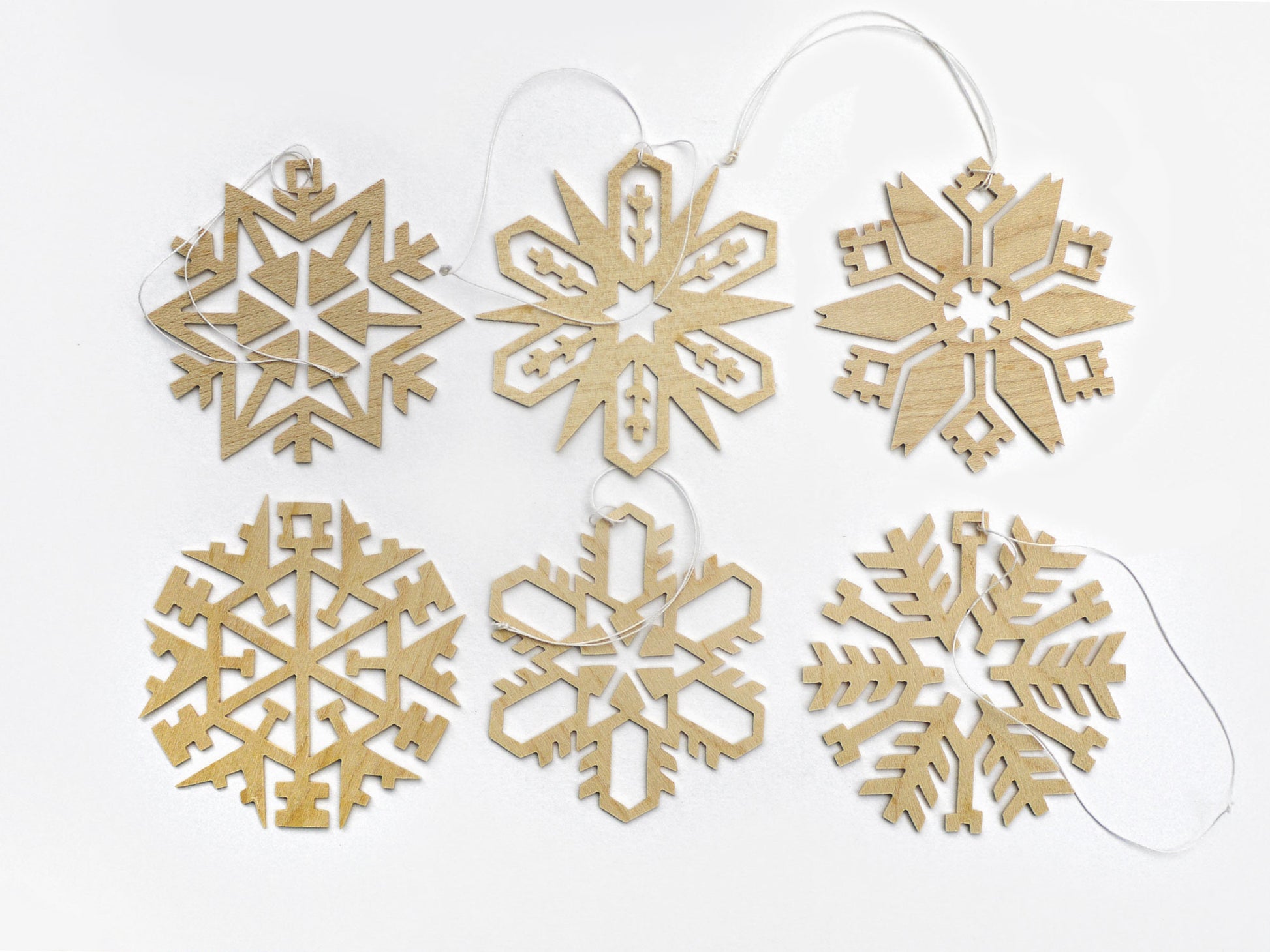 Picked up on a rainy day in Berlin, this set of original East German tree decorations comprises 6 wooden snowflakes. Delicate shapes, made of thin ply, which measure around 60mm diameter. The set of 6 come in a screen printed wooden box.