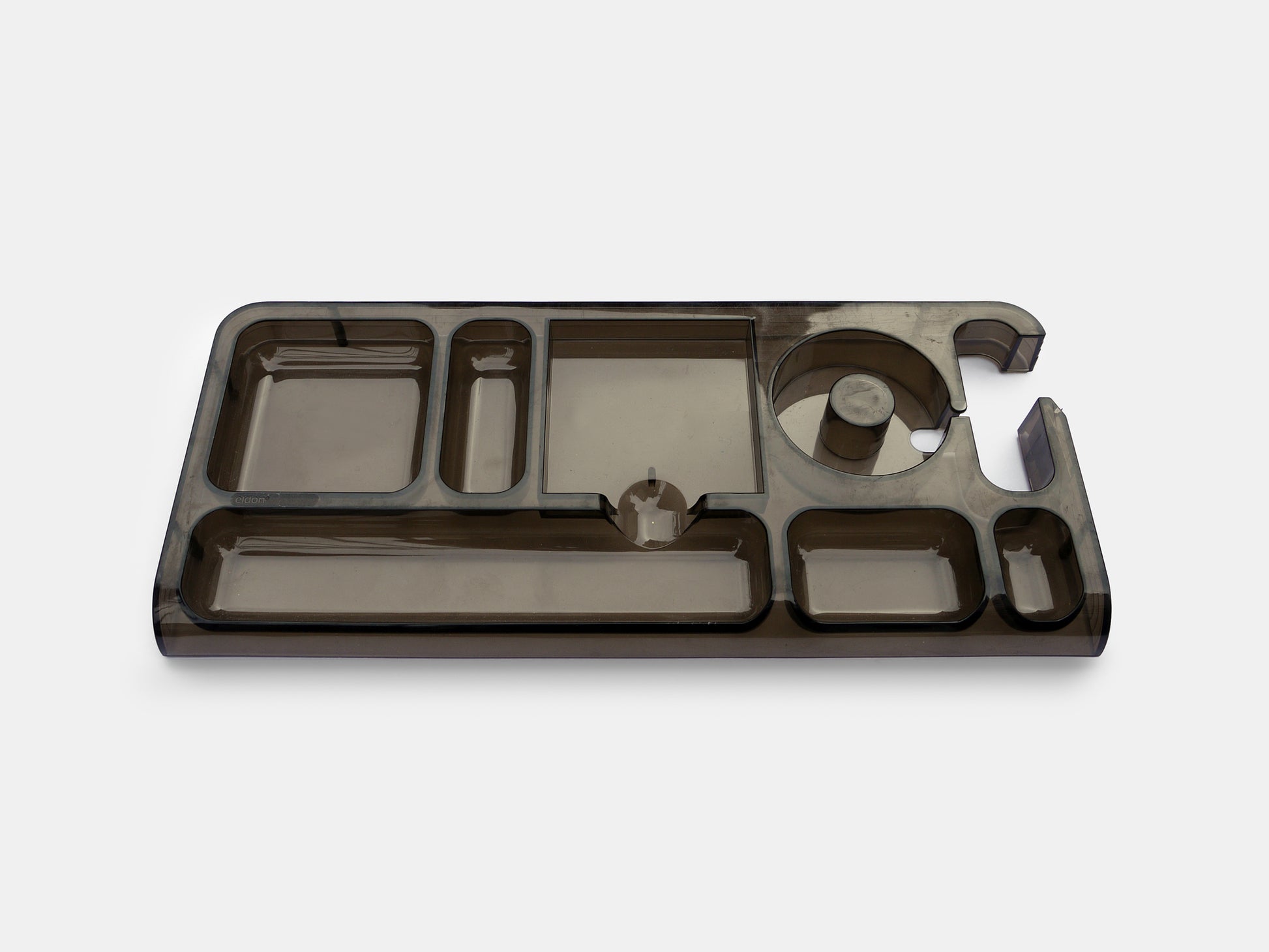 In a smokey grey perspex, this desk organiser from the 90s even has a built in tape dispenser. It's a brilliant, flat unit which will comfortably house pens, pencils, clips and tape. It measures 325x140mm. Good condition.