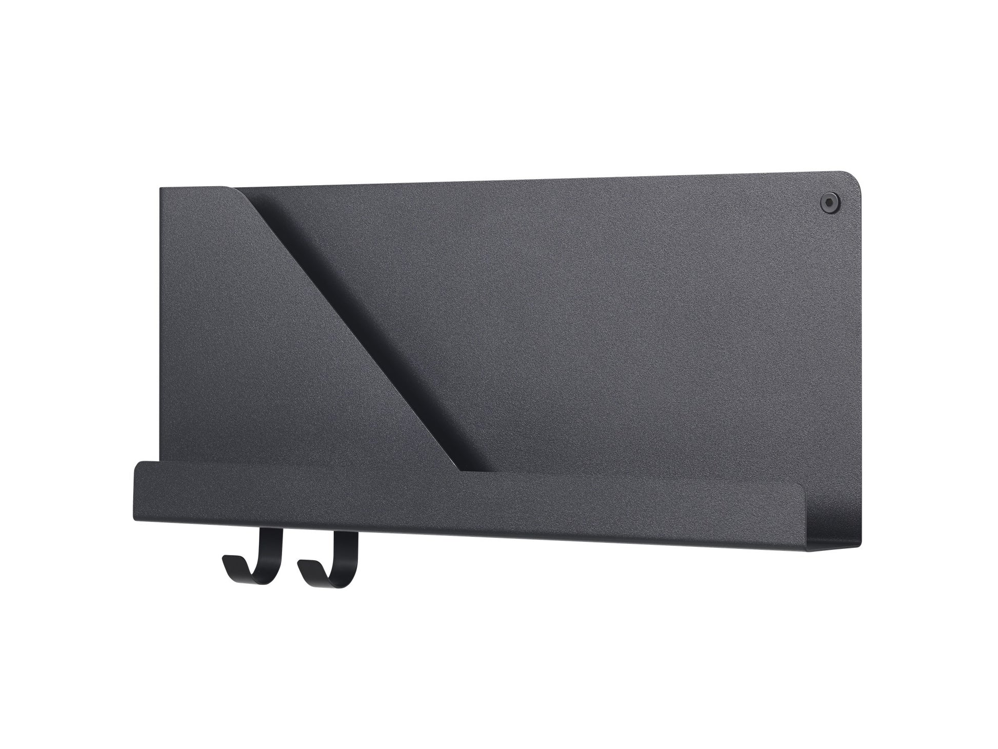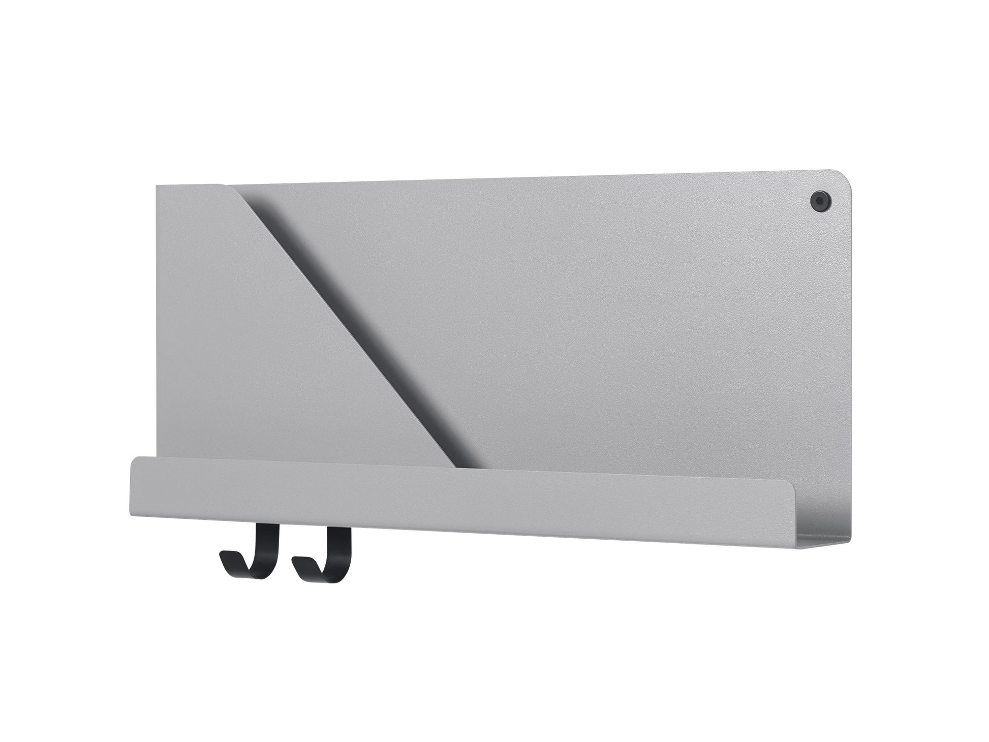 The 2mm steel units are incredibly sturdy, and come in three matt colours. Each also has optional hooks for hanging items from the bottom. Wall fittings are supplied.