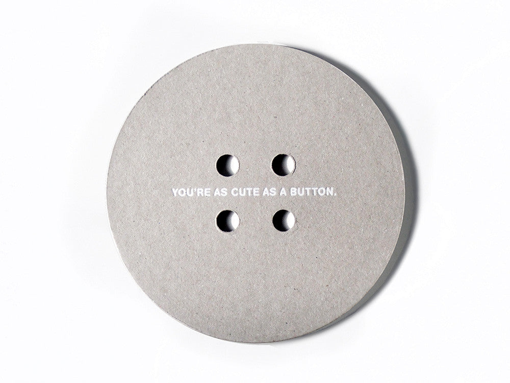A giant button debossed in card, and foiled with 'You're as cute as a button' on the reverse. For friends, lovers, anyone! It measures 120mm diameter and comes with a white card.
