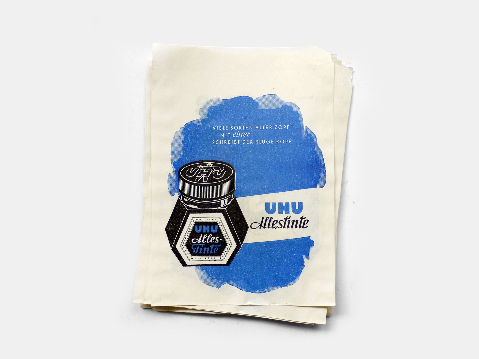 On a recent market trip this is the first gem we found, a bundle of these old, mint condition glue/ink promotional bags from UHU. On one side a tube of paste, and on the other a jar of ink. Perfect.
