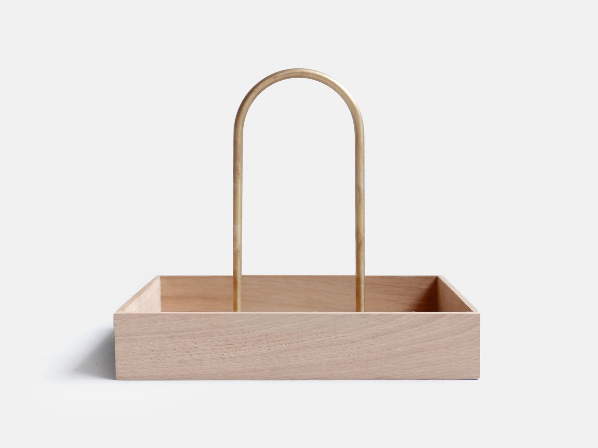 A fun and smart desk tray featuring a beautiful brass handle, so you can carry it with ease. The tray is made of unfinished oak and measures 220x150mm, the handle is 18cm high. It comes in a box, to be assembled with enclosed screws.