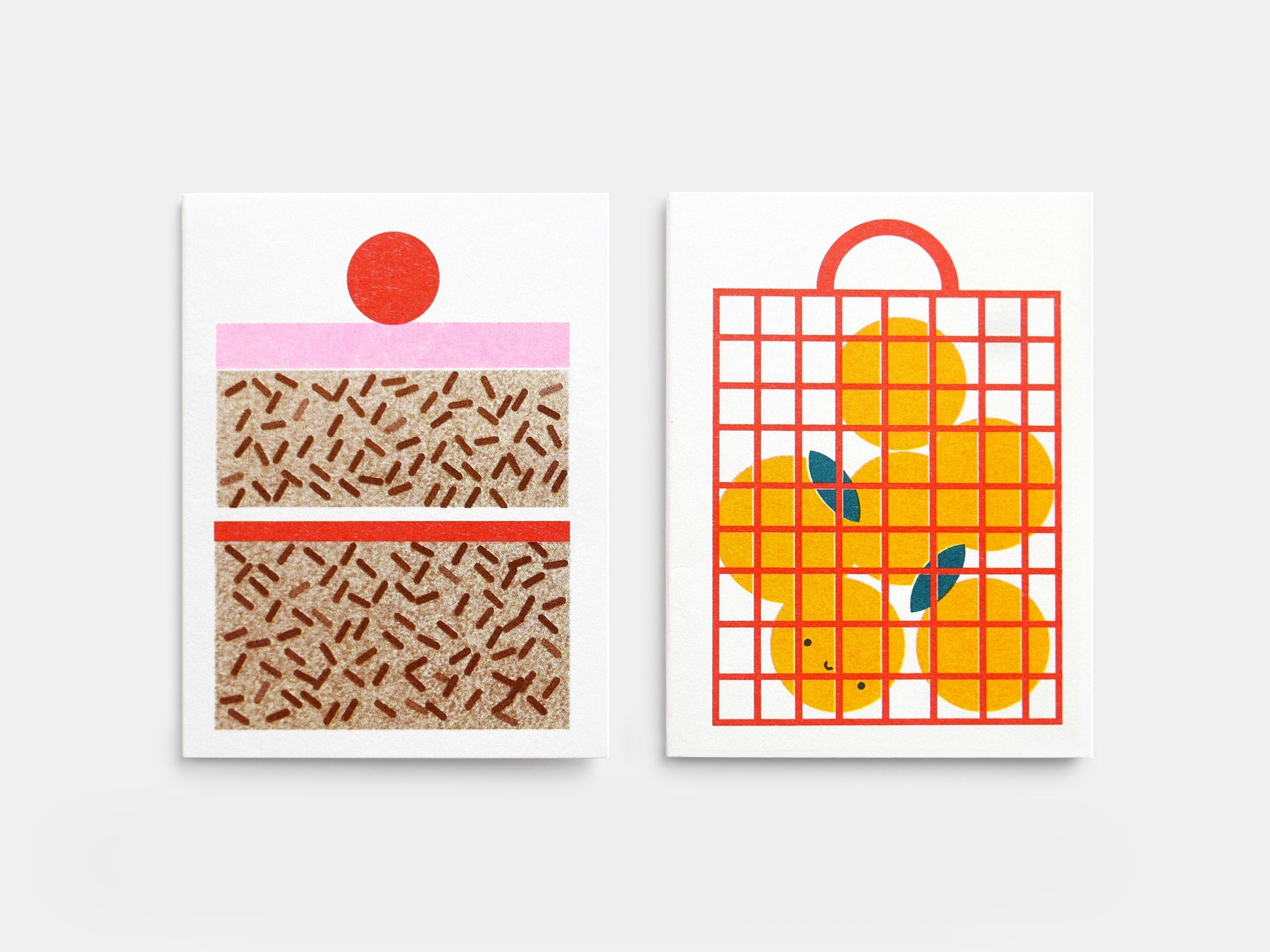 In the interests of a balanced diet we have both cake & fruit to send to a friend or loved one. These Riso printed cards, from Scout Editions, measure 105x78mm and are blank inside. Pick your favourite.