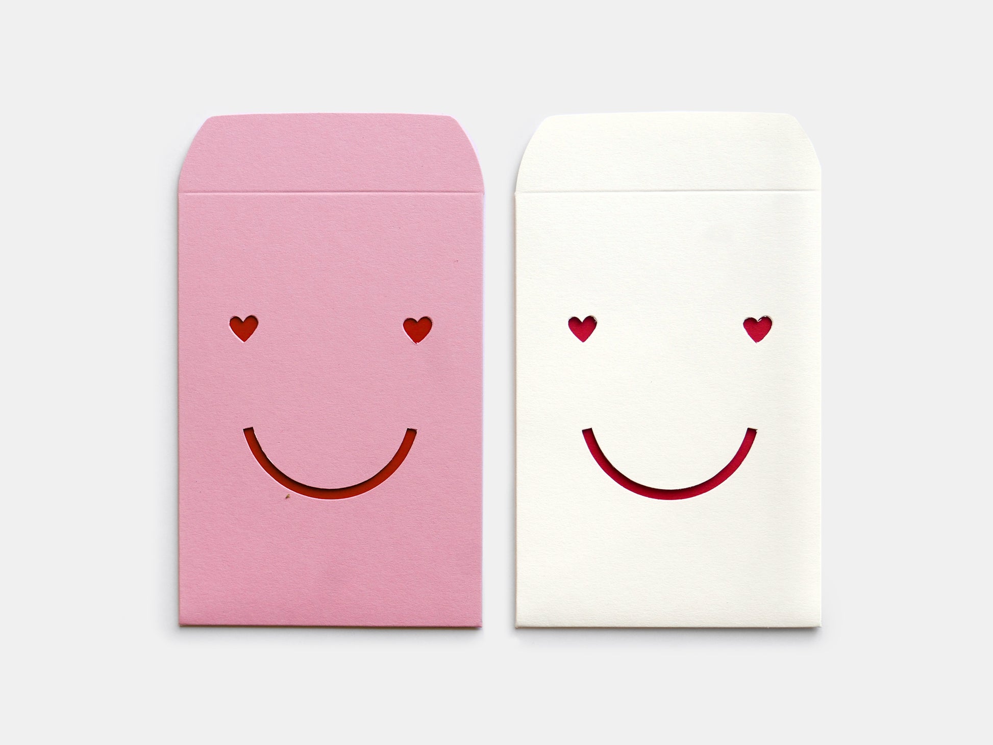 The happiest mail of them all. Heart eye & smile die cut from thick paper envelope, and inside a blank red card for your missive.