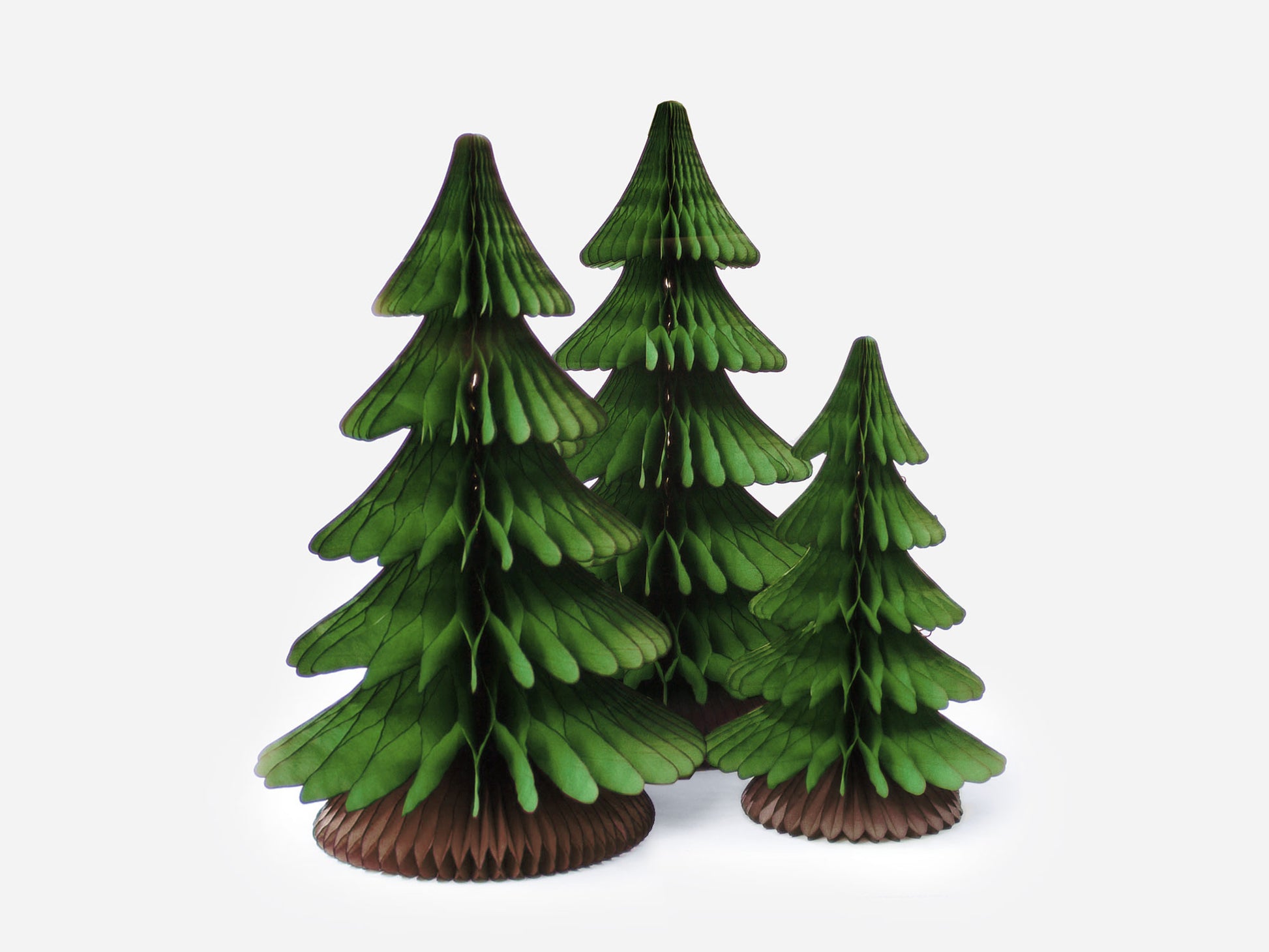 For us honeycomb tissue is evocative of Christmas decorations from childhood. We love these simple Alpine trees, that are delivered flat but open up to a three dimensional paper fir.