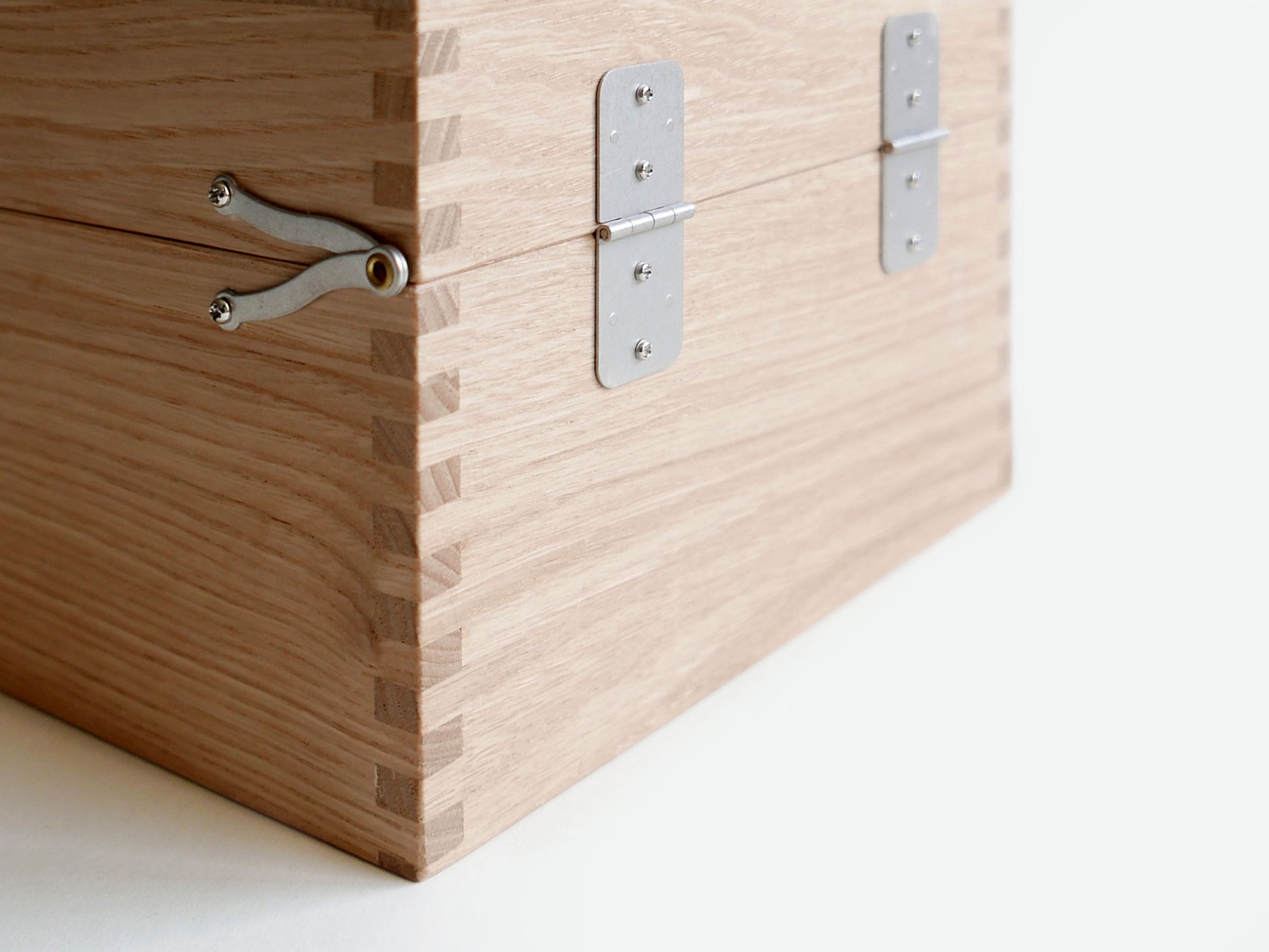 Inside you will find a removable divider. The box stays closed thanks to some discrete magnets. 176x116x124. Made of Chestnut.