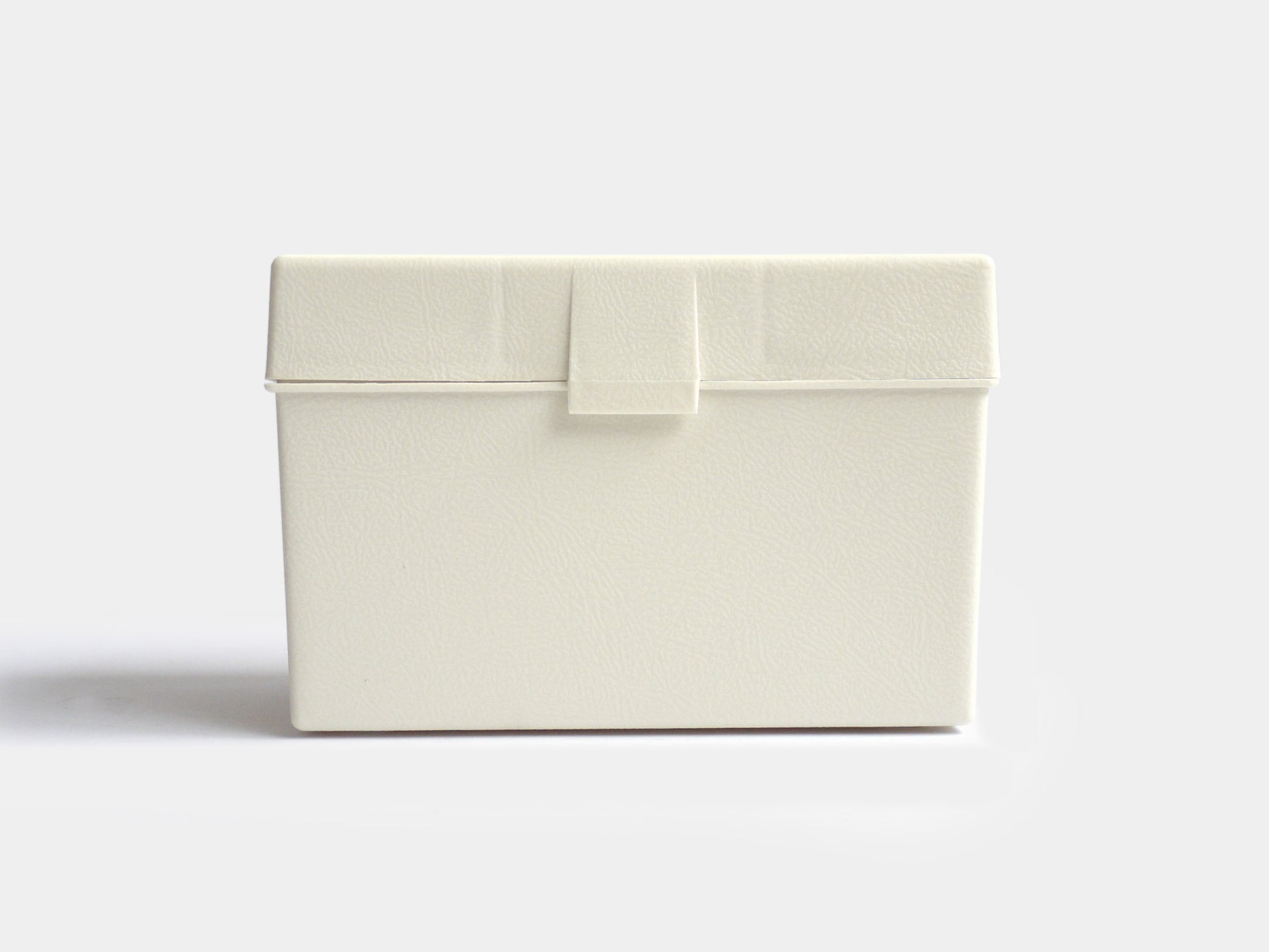 Plastic index boxes, brand new dead stock, which are a great place to store photos, keepsakes, index cards & recipes. The box has a hinged lid and is cream.