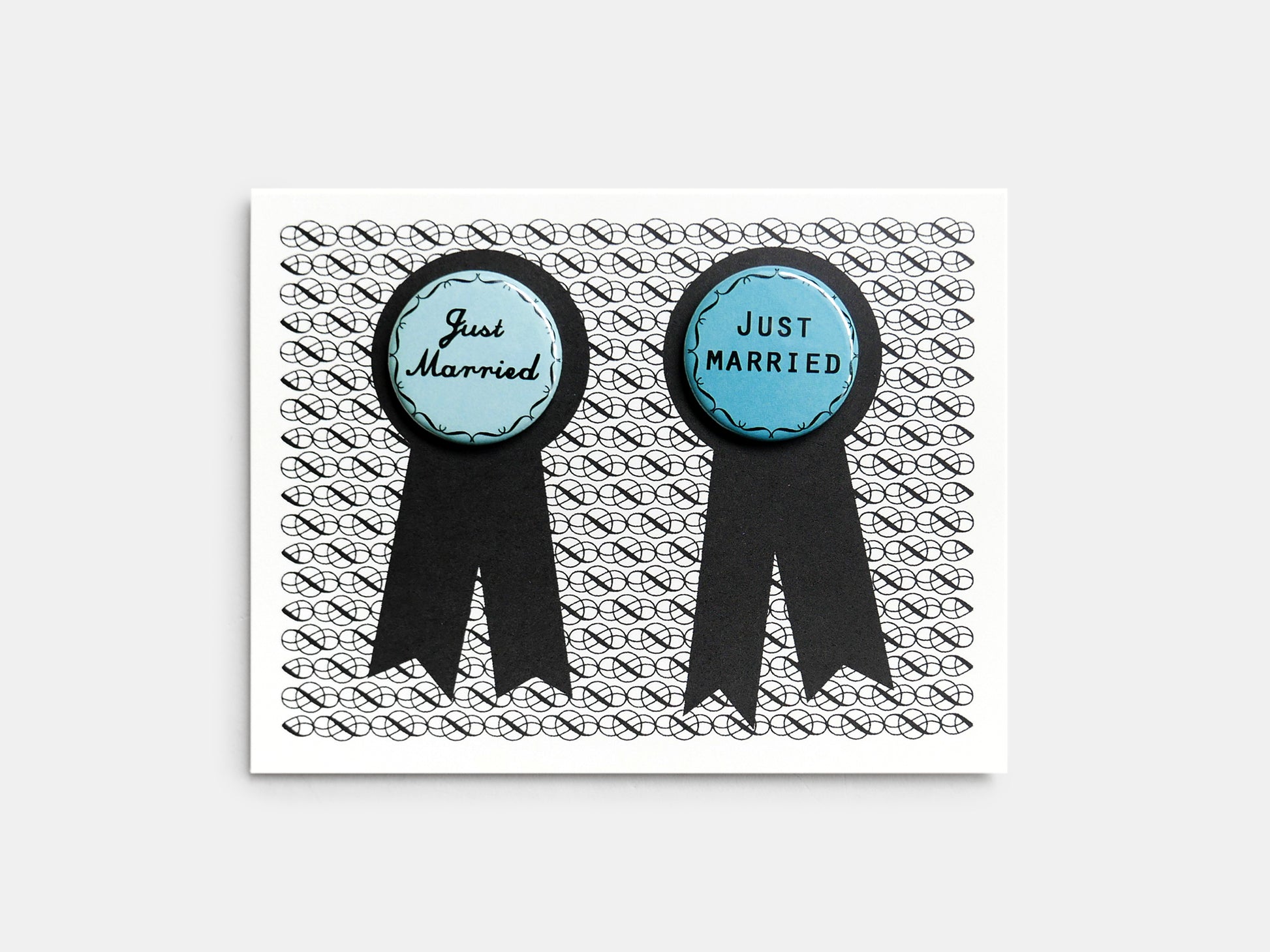 A perfect card for newlyweds, with a colourful badge for him & her, him & him, her & her.