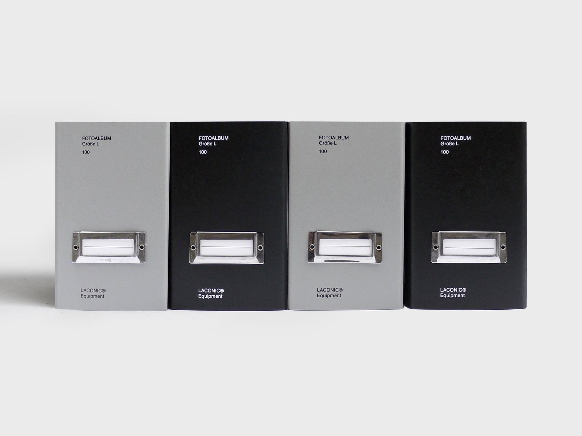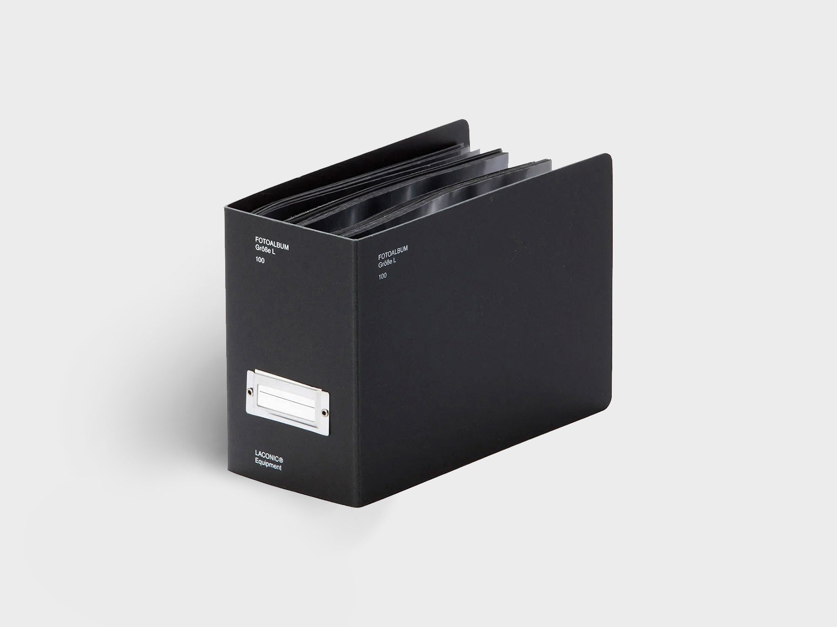 A box file like photo album for 100 photos, fitting one image per page. It has a metal index window, for labelling purposes, and comes in black or grey. The cover is a laminated card, and the interior pages are plastic. 150x105x65mm.