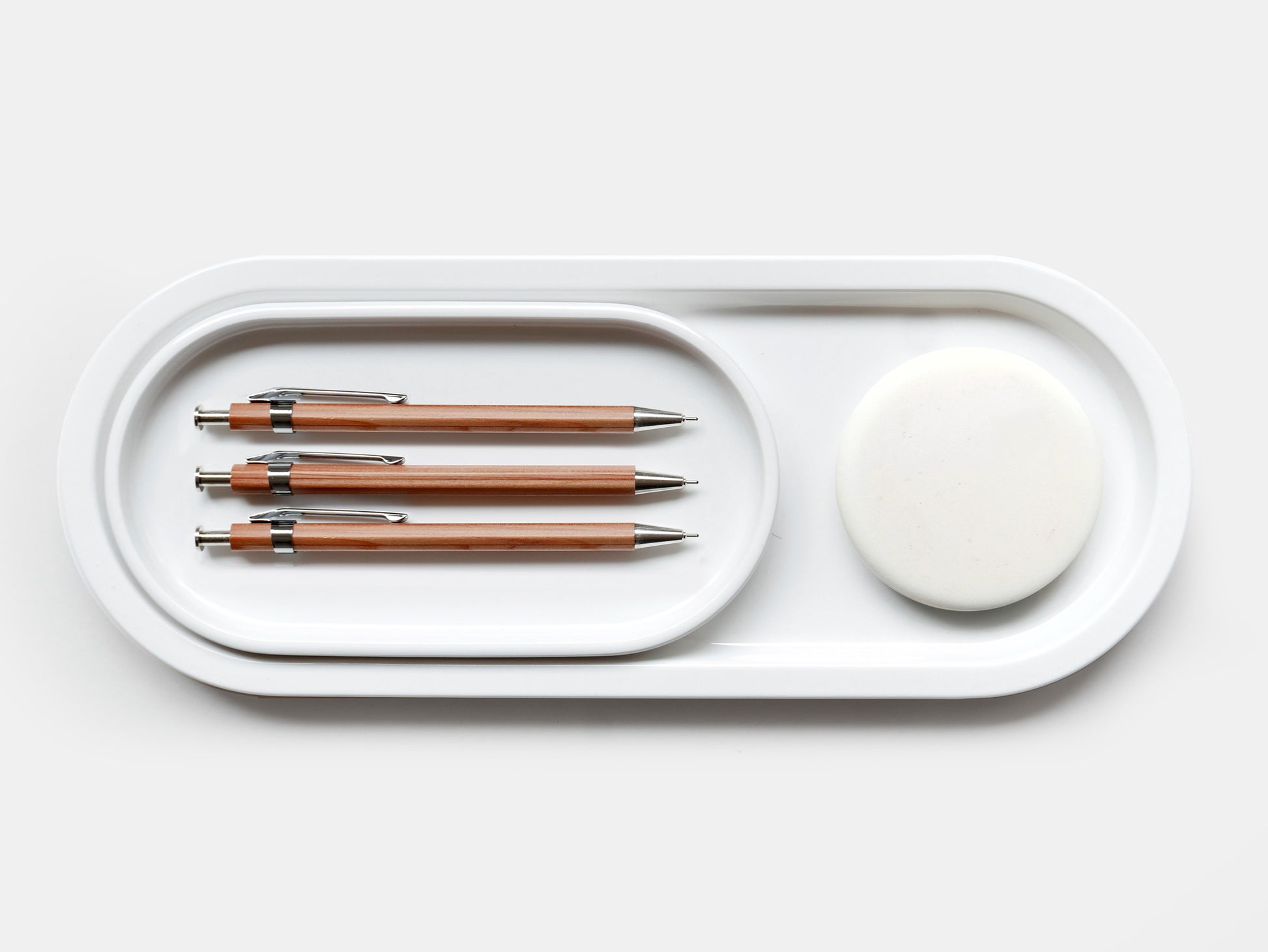 Two desk trays in crisp white melamine which, if chosen, sit neatly into one another. They are perfect for all manner of writing implements and look clean and timeless within any context.