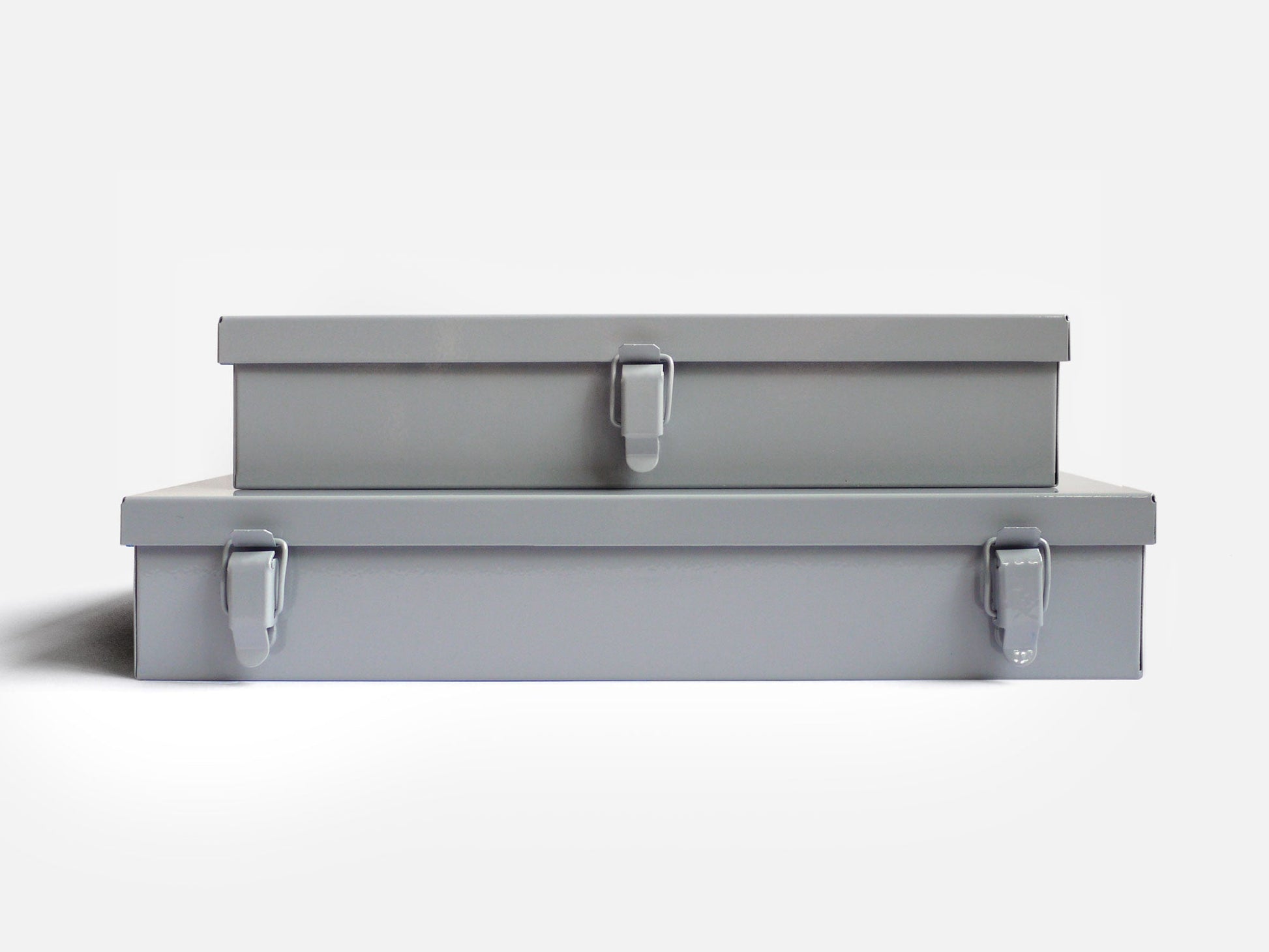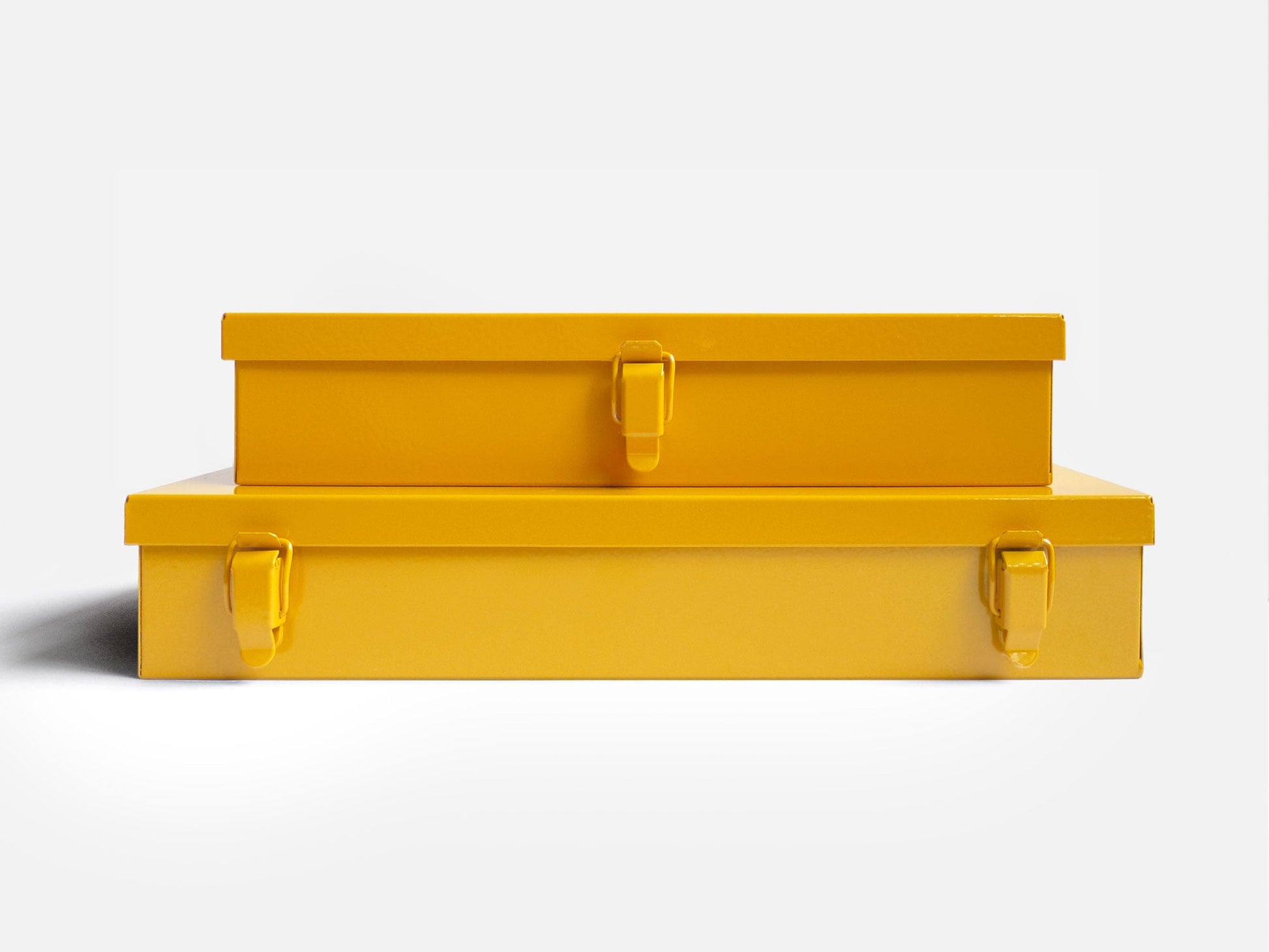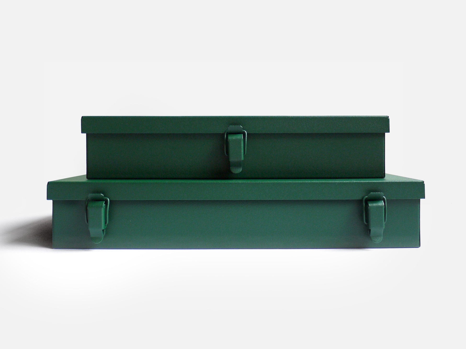 Smart storage boxes, made from steel & sprayed/powder coated in three colours. The boxes are excellent for desktop papers or tools and can be stored vertically or horizontally.