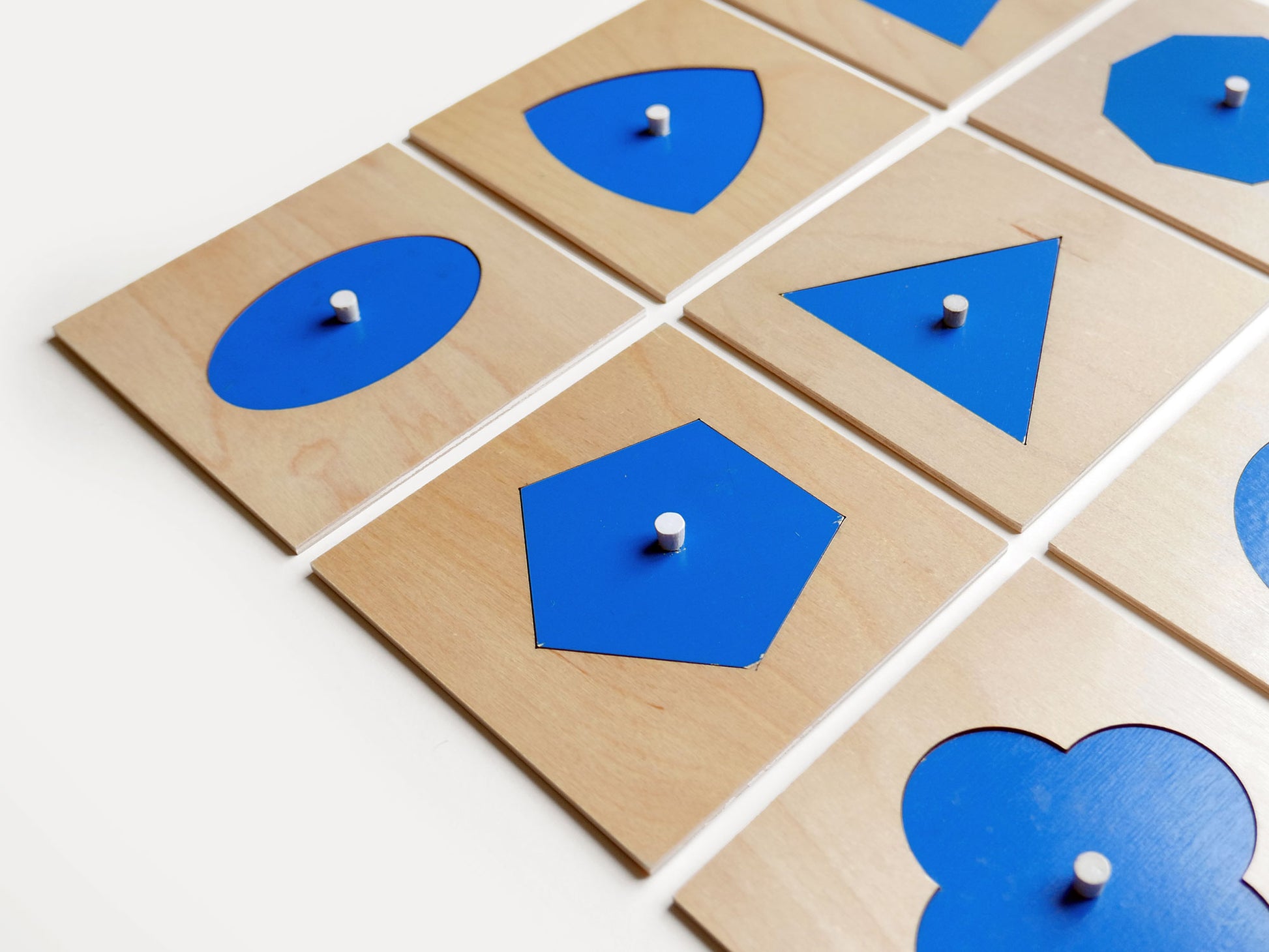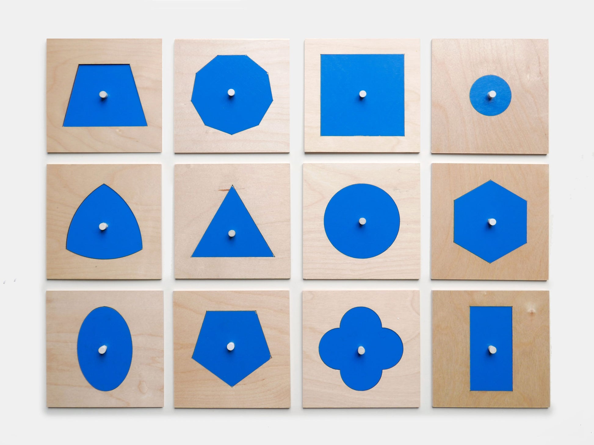 Simple geometry explored in this series of Montessori puzzles. Each wooden square has a clean cut out, and the corresponding shape has a small white knob. They measure 140mm square and are yellow on the reverse.