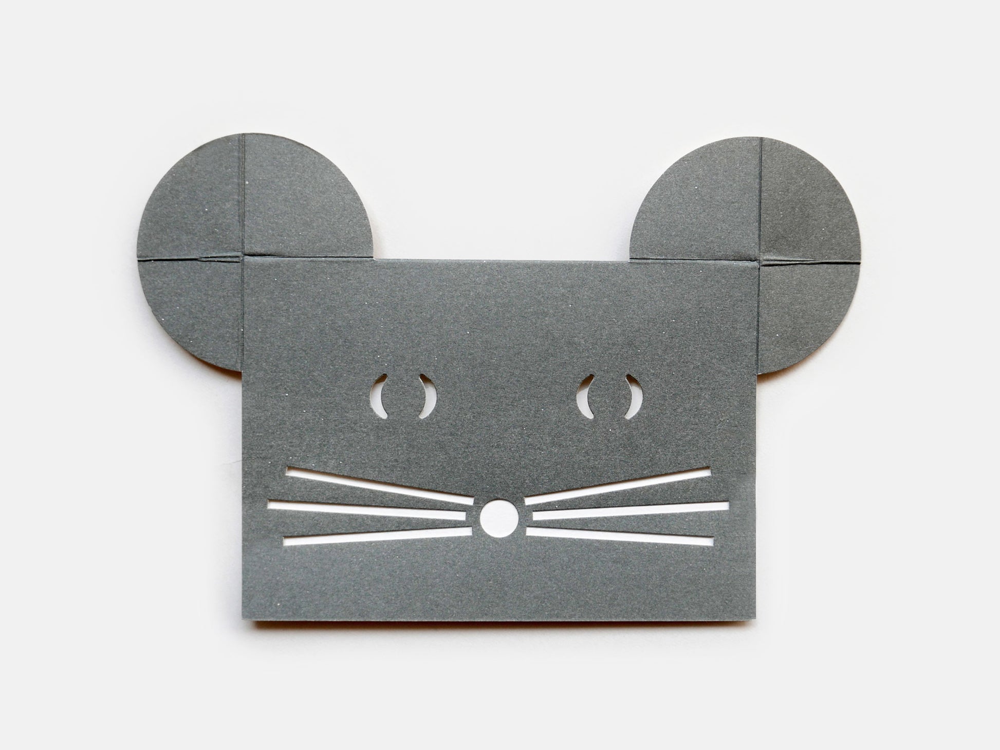 A card which, once opened up, becomes a charming grey mouse! Blank inside, for your message. Cheese not included.