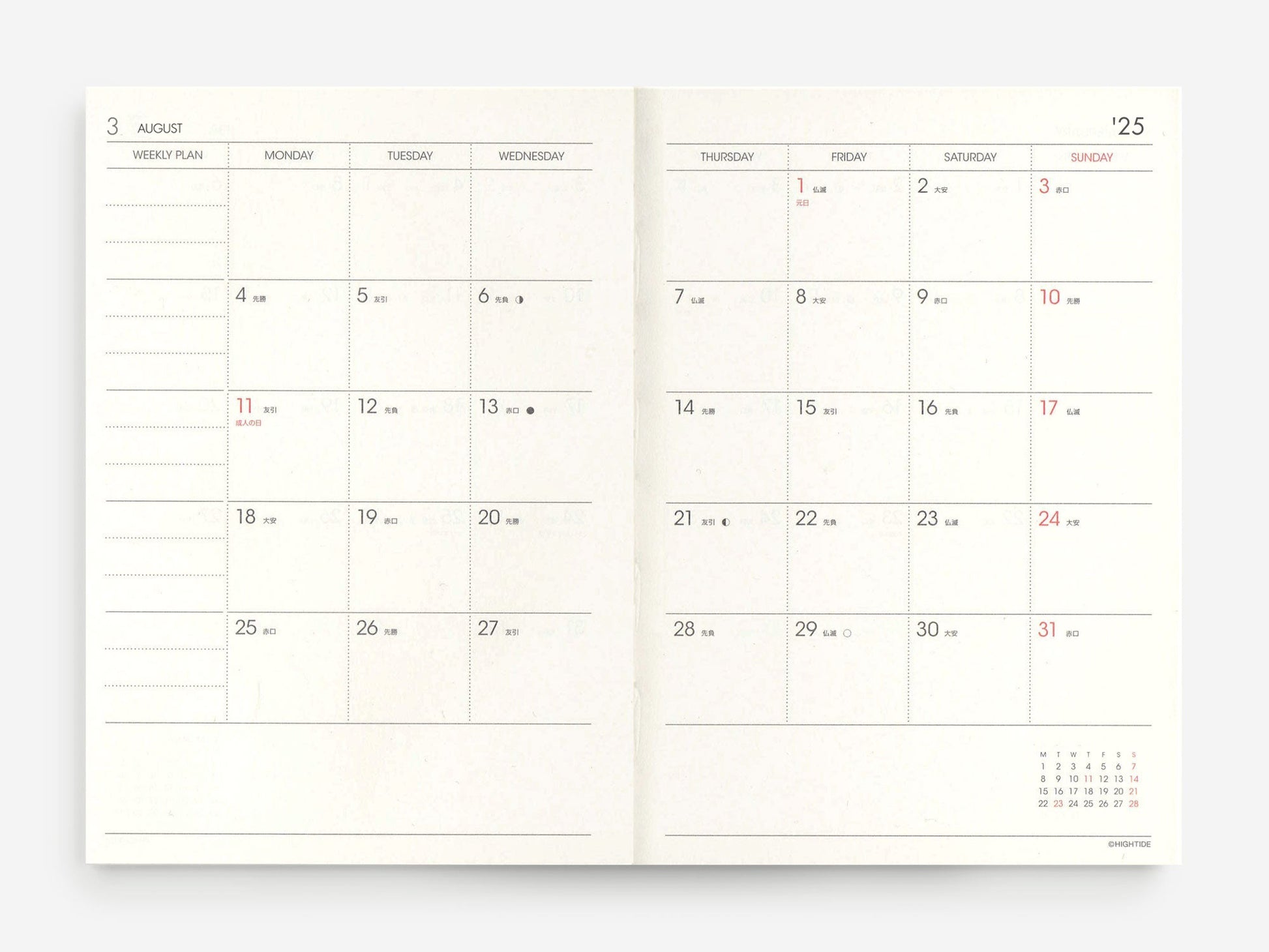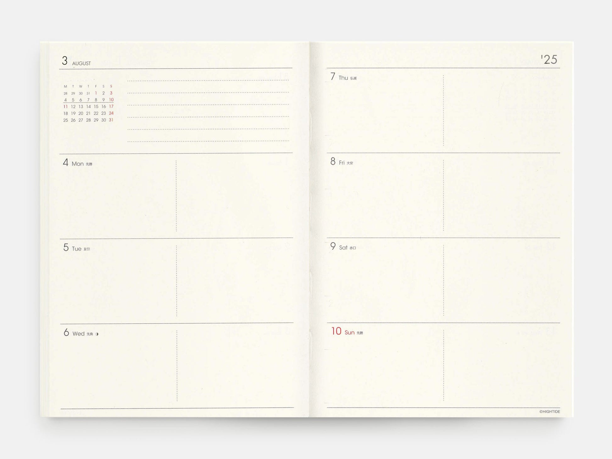 The paper is smooth, cream and fountain pen friendly. The book is paperback, and comes with a plastic protector cover. It measures 145x110mm and runs October 2025 to January 2027.