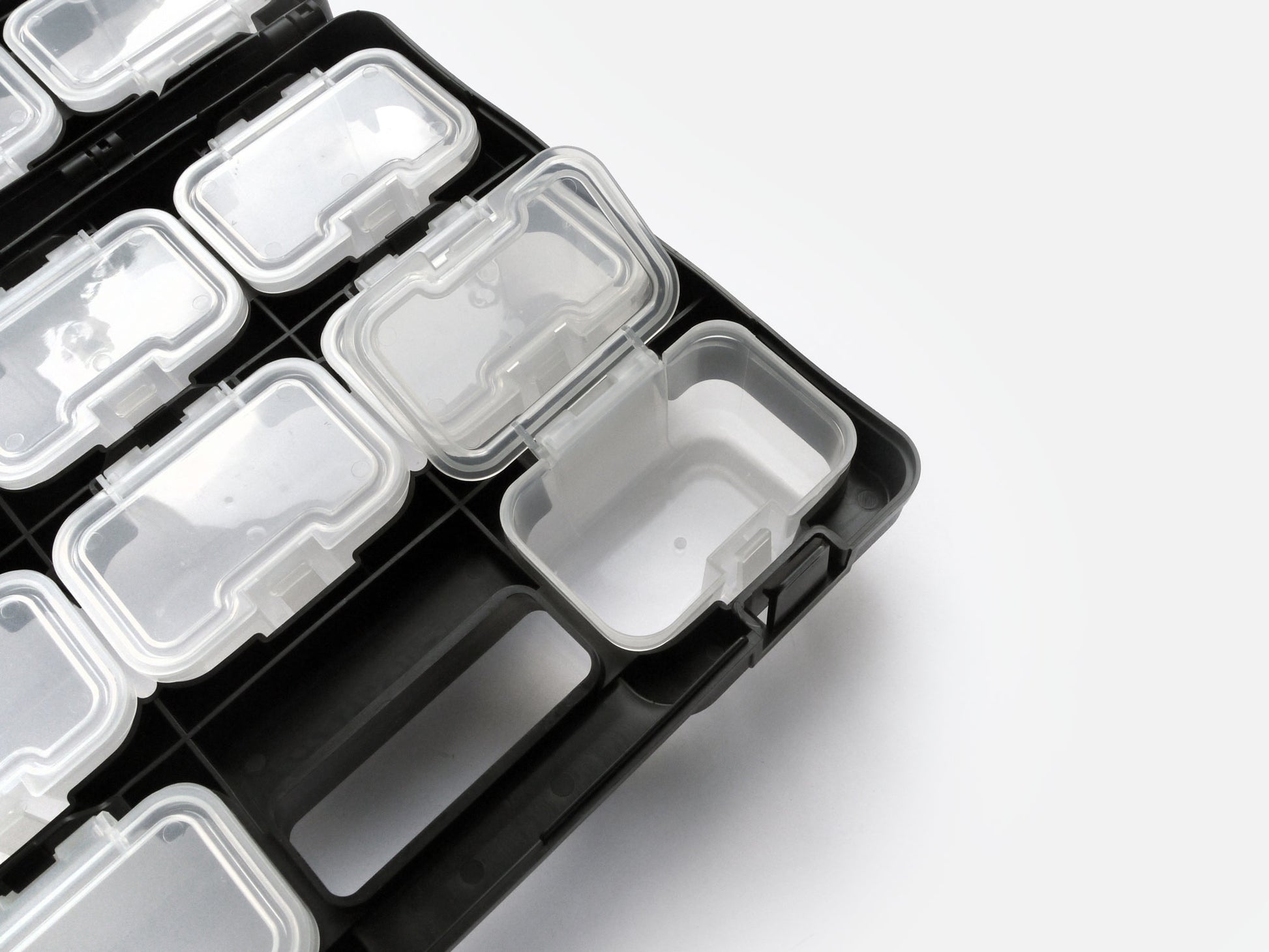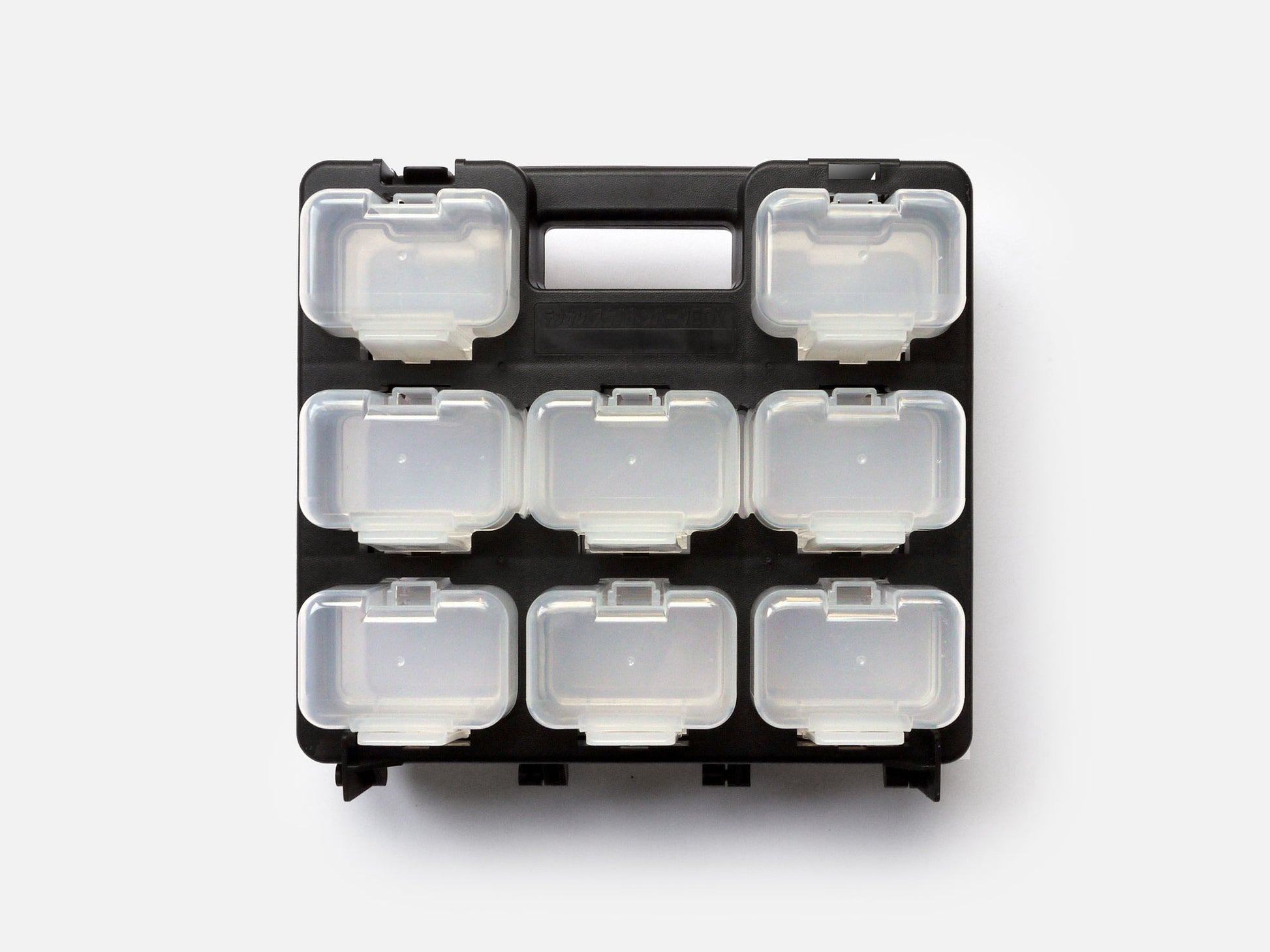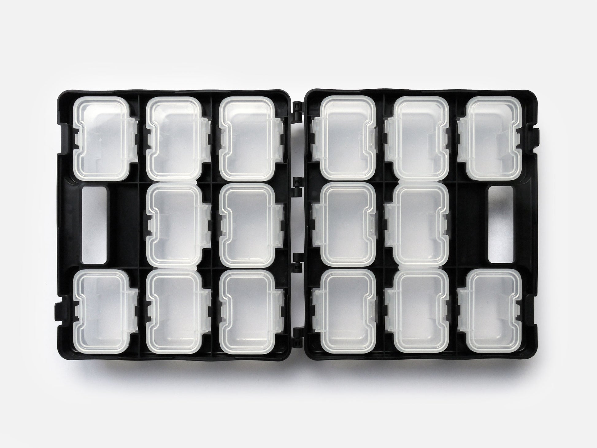 Travelling with your eraser collection just got easier thanks to this exceptional suitcase. It's a parts box, and a bag combine. 16 individual boxes, in a fold out case which is perfect for storing and carrying small office/craft supplies or perhaps even crudités.