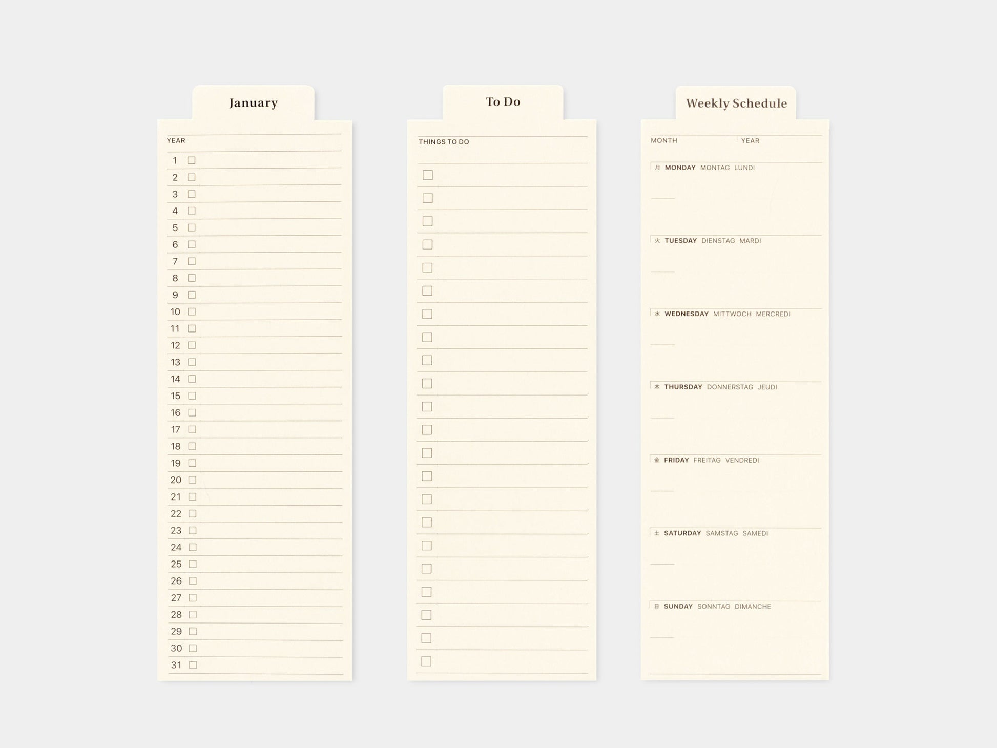 A delightfully simple, but very clever, idea which combines bookmark with planner capabilities. These uncoated, cream paper strips, which fold over at the top to sit onto a page, come in three varieties: month schedule, week schedule or to do list.