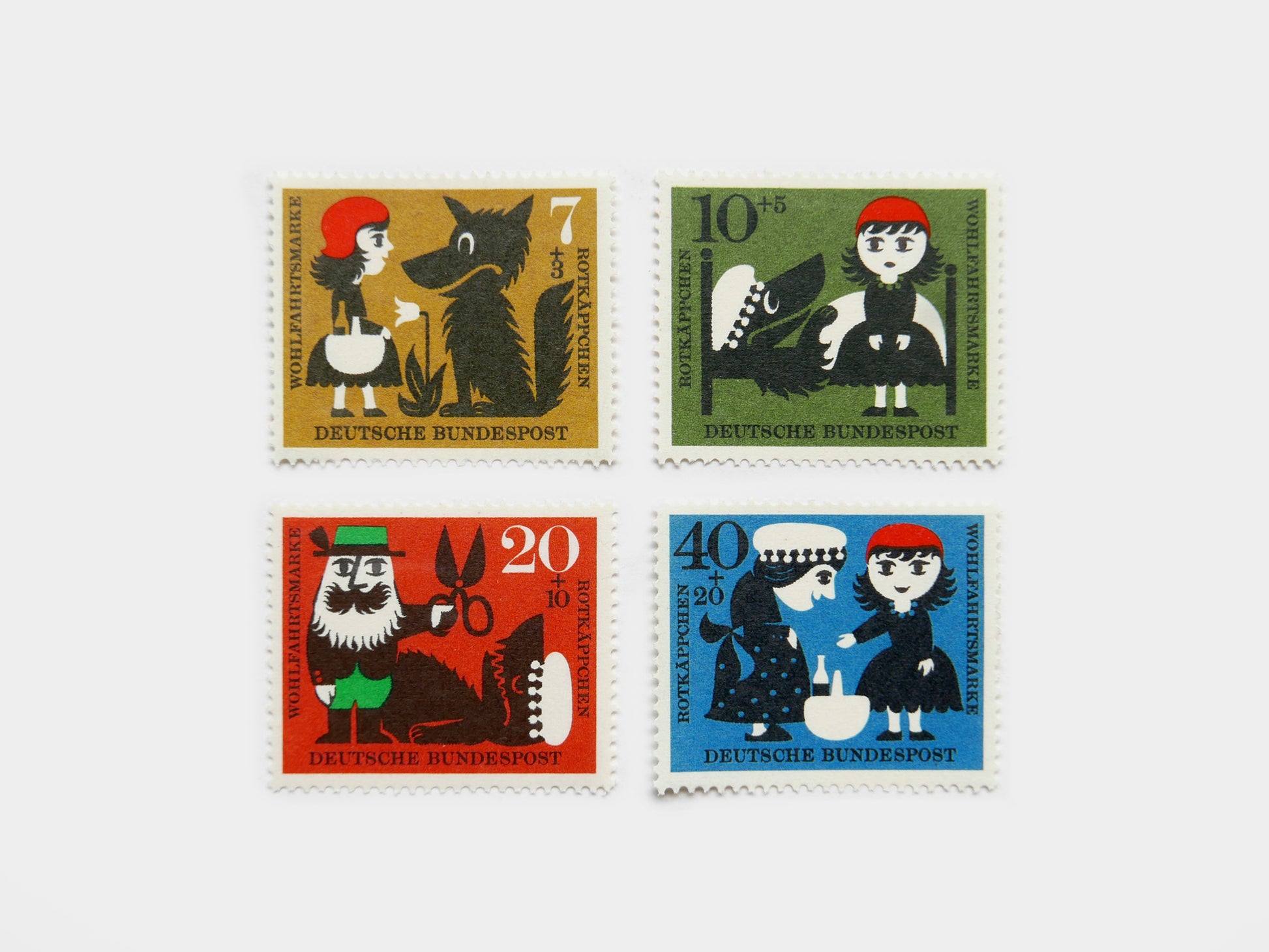 Published in Germany, in 1960, these ridiculously sweet Fairy Tale stamps depict the classic tale of Little Red Riding Hood. Use on cards or pop them in a frame. Set of 4.