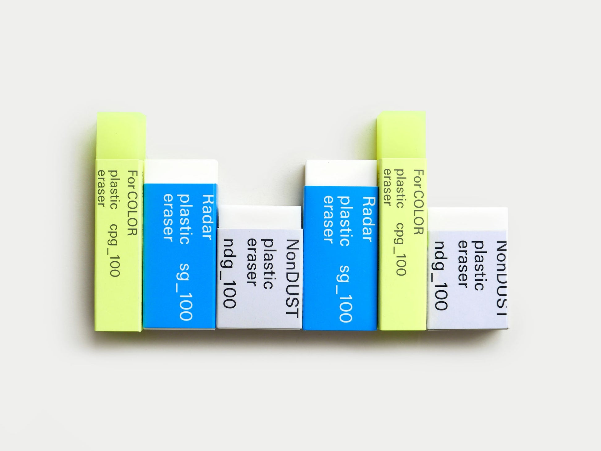 The yellow eraser is designed for coloured pencil. The grey, for pencil, will leave no dust. The blue, also for pencil, is soft & reliable.