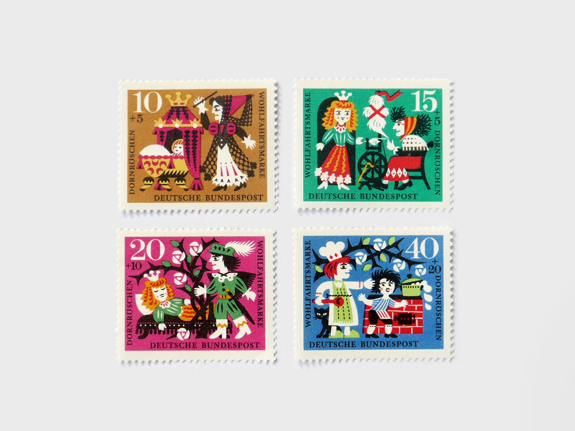 From 1960s Germany comes this charming Fairy Tale stamp set, beautifully illustrating the tale of Sleeping Beauty. They are the fairest of them all.
