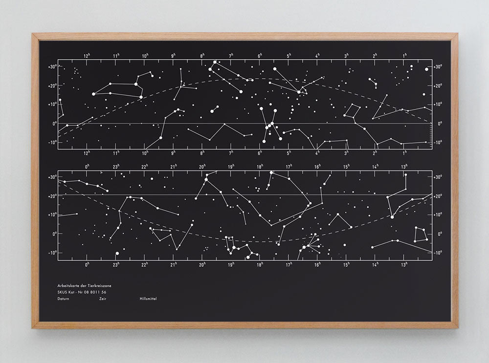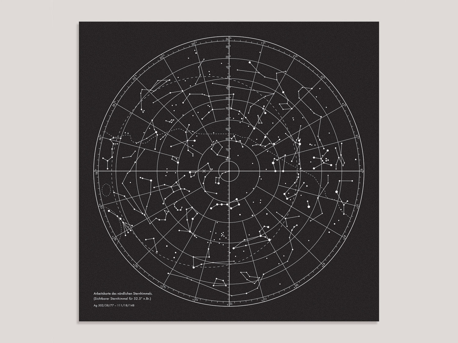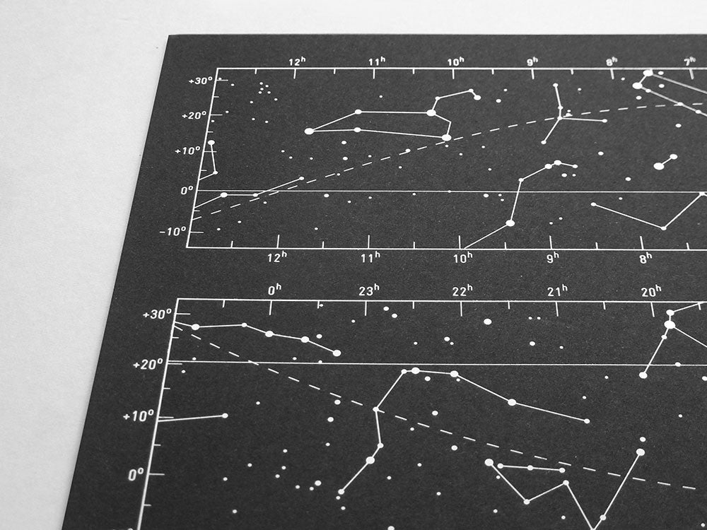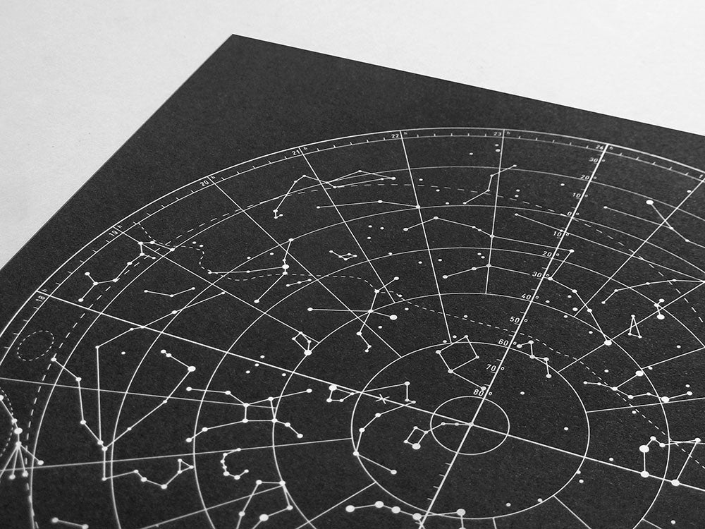 Intricate diagrams of the stars at night, foiled in white onto black card. There are two sizes to choose from.