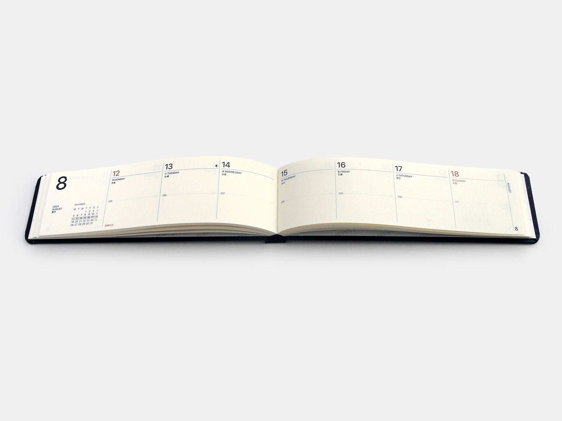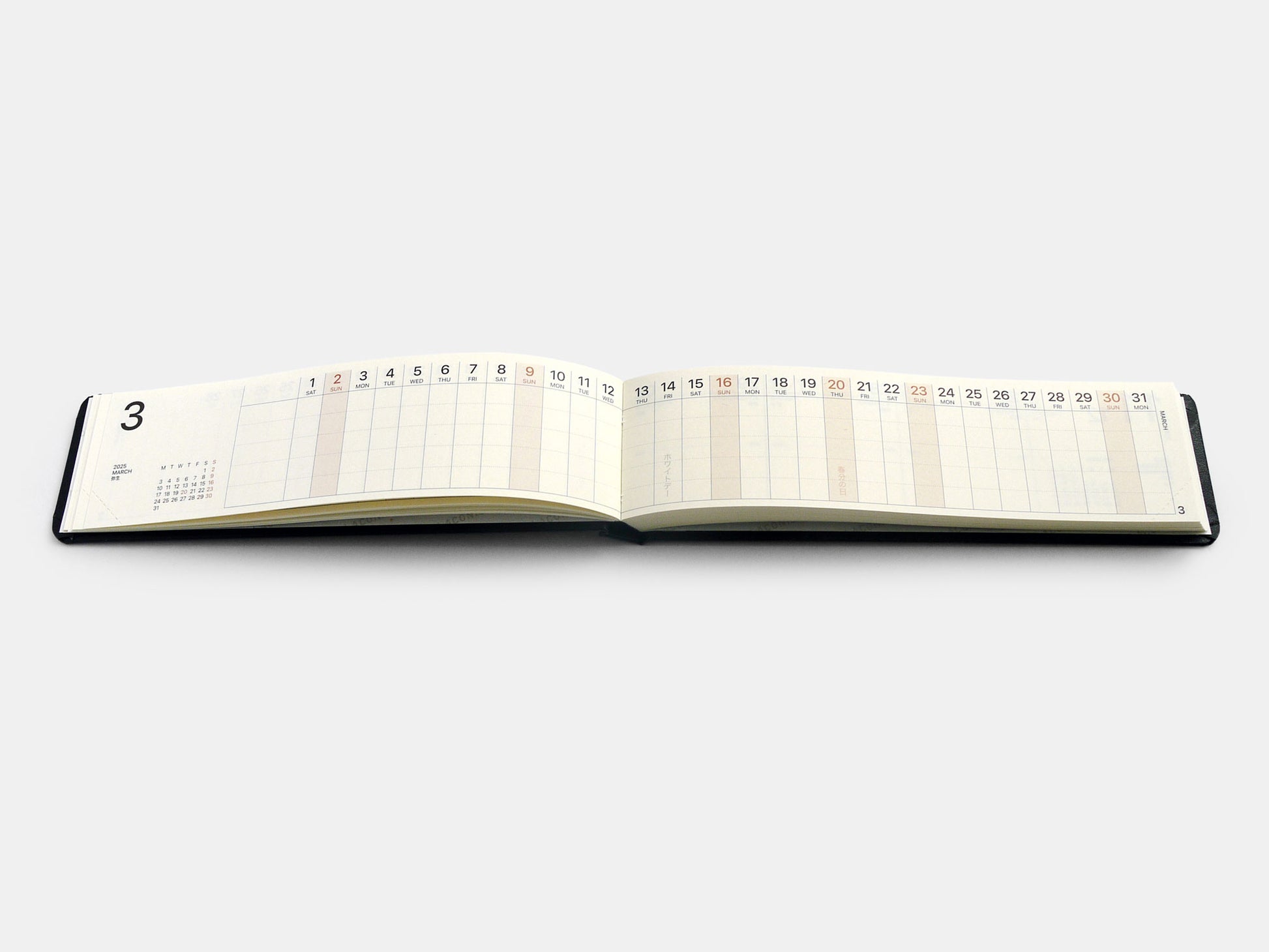 An unusual but pleasing format for a diary, and the origins of its 'stick' title. Long and thin (155x48mm) it is a hardback bound book with a horizontal month to view, then week to view. Excellent for pockets on coats & bags.