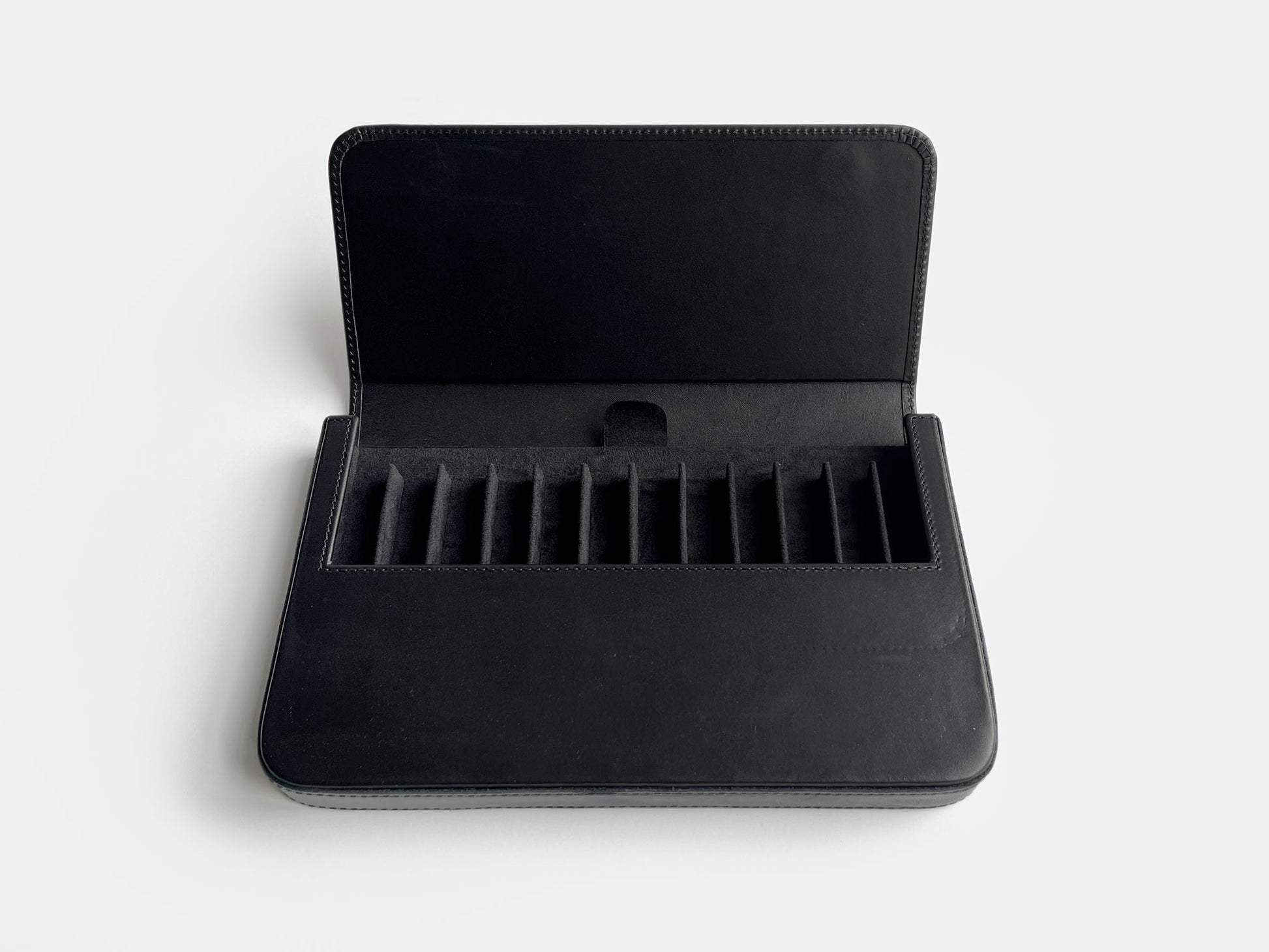 The larger version of this. For writing whilst travelling, or for storing your favourites comfortably, these hard leather pen cases are a very welcome addition to P&C. Handmade in Turkey, the cases close with a firm hidden magnet and have a slide out tray for storing up to 6 pens.