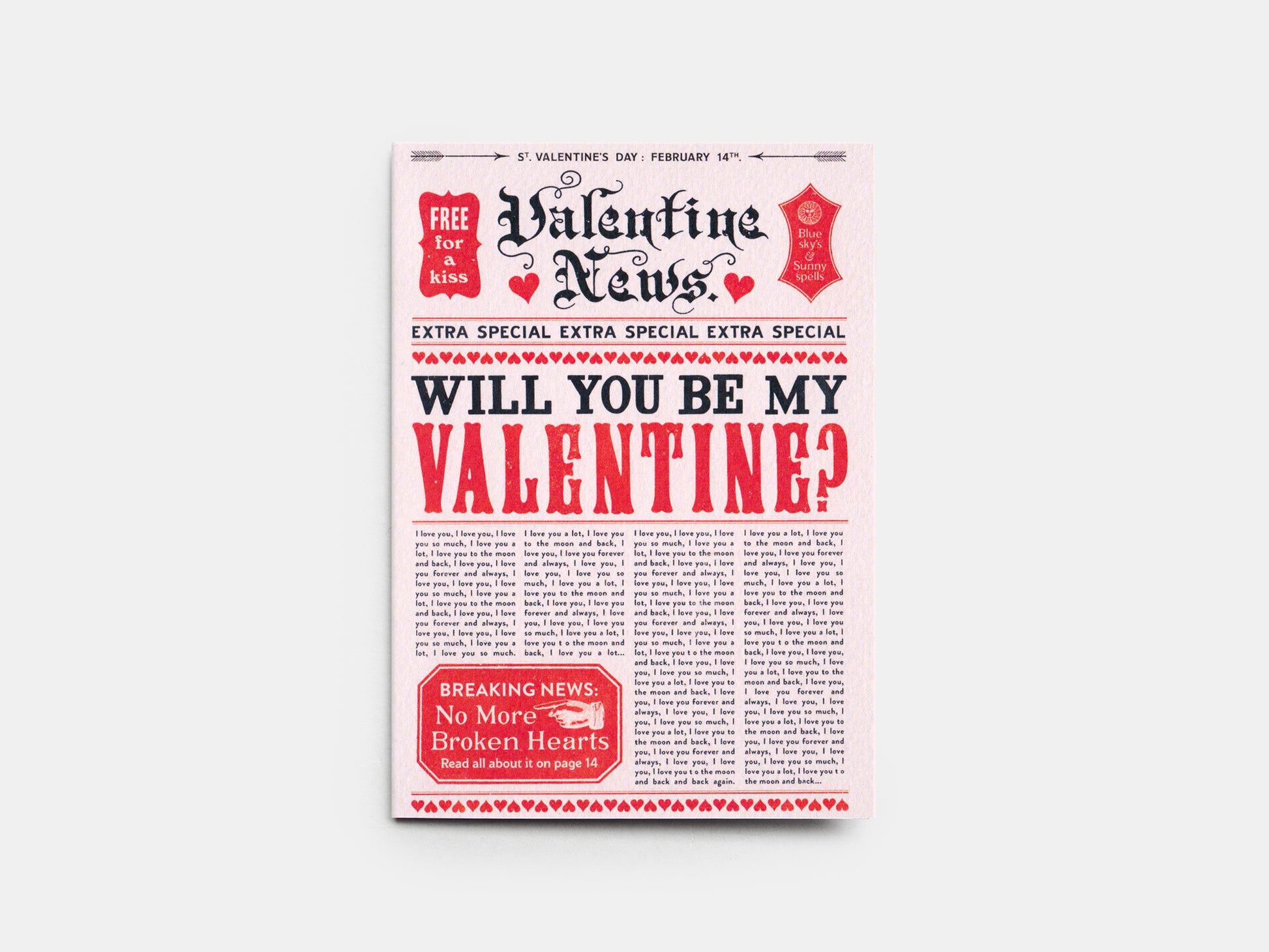Hold the front page, a newspaper style card for declaring one's love in typographic style. Created by Flora Fricker, a designer for tv & film ephemera. Blank inside.