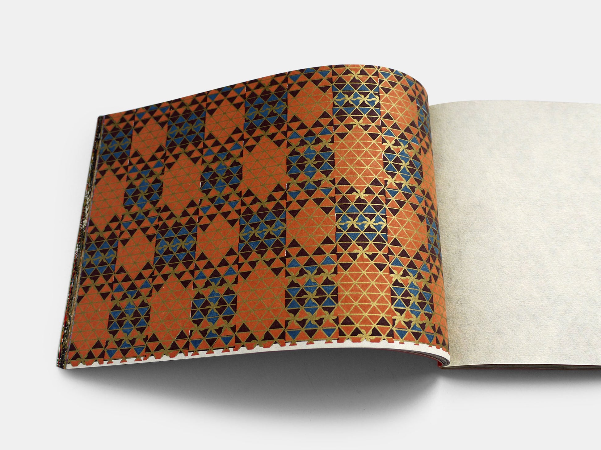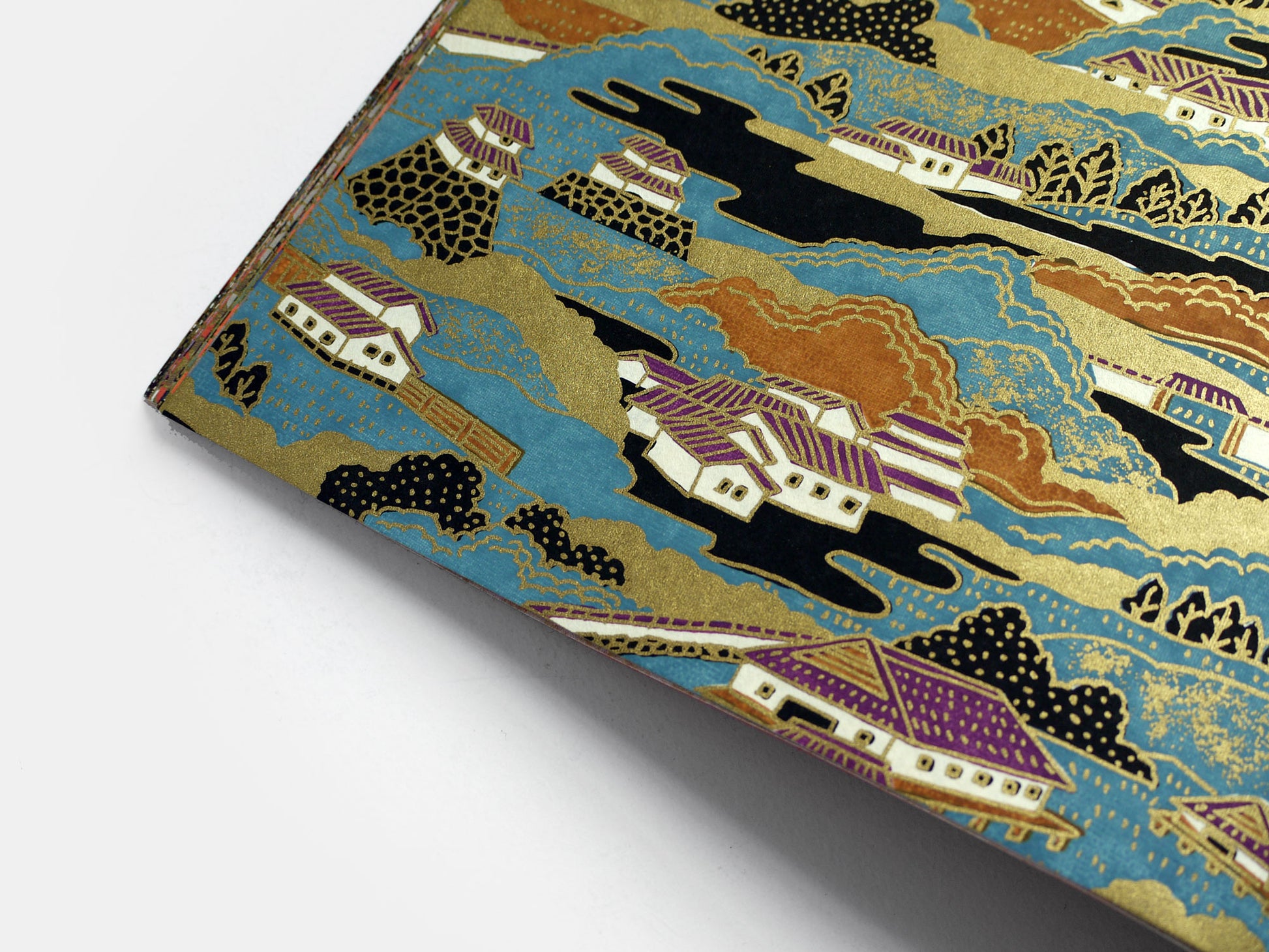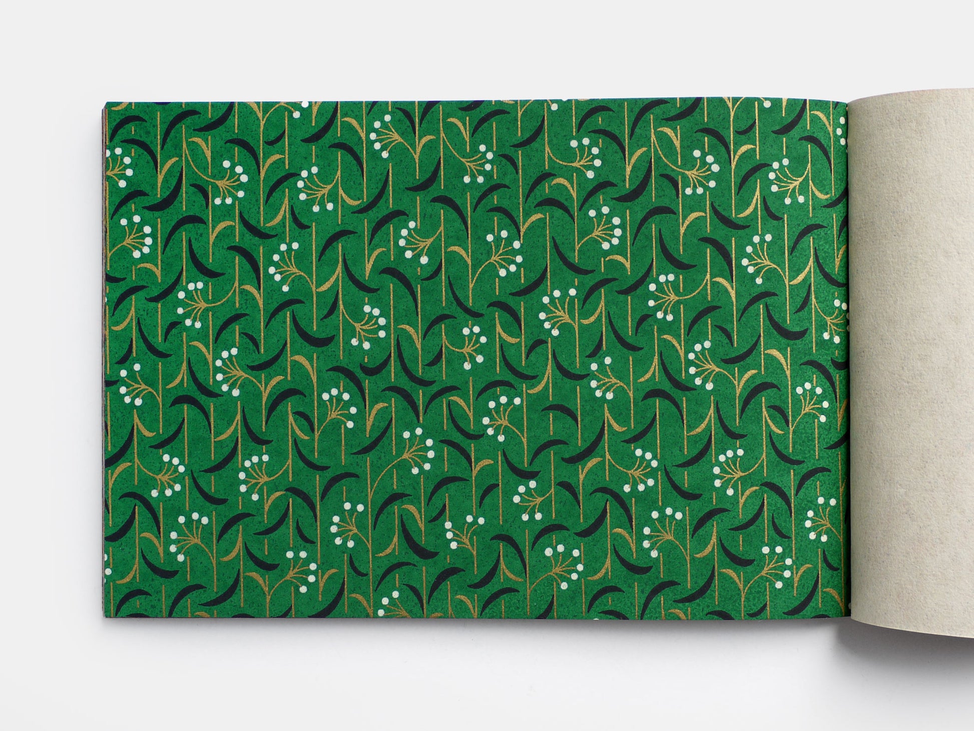 50 pages of heavily patterned, colourful washi papers which were printed in Kyoto between the 1950s and 2000. The book has repeat patterns, in varying colour ways, and the book content may vary as these are produced from offcuts.