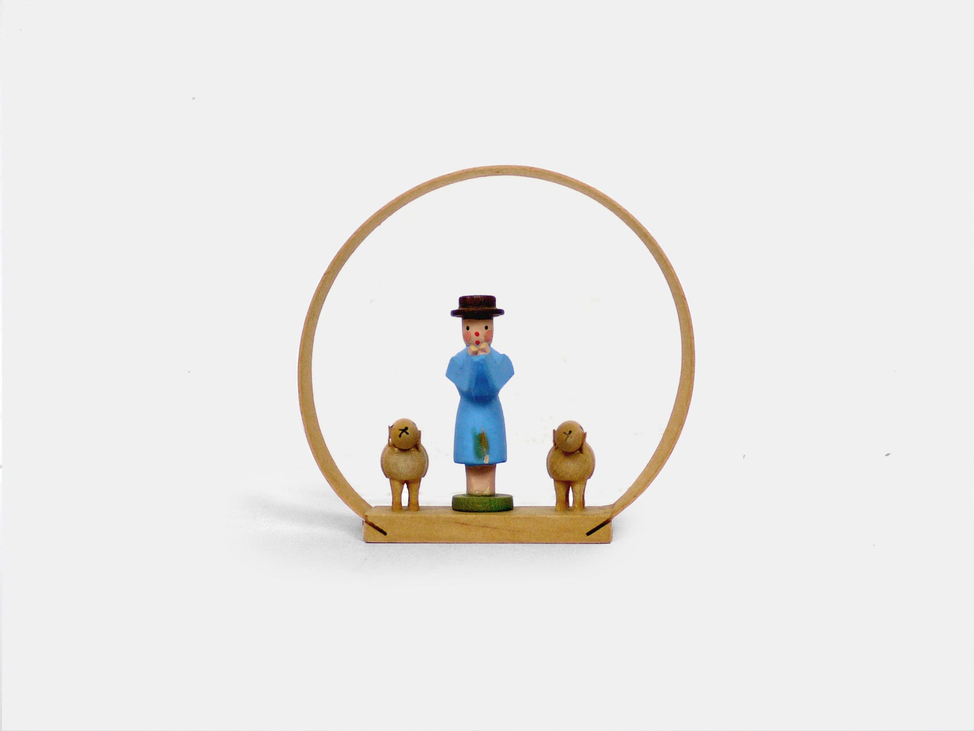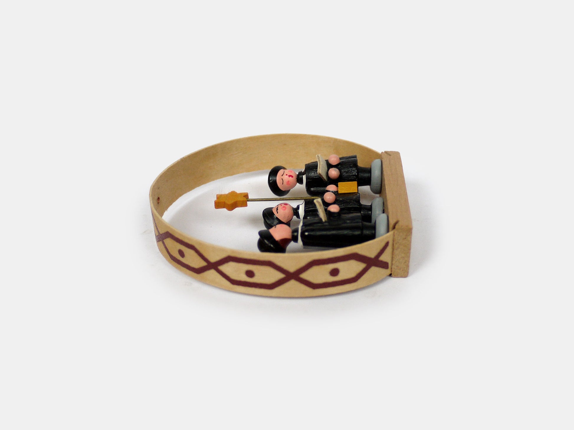Unique tree decorations comprising a patterned wooden hoop into which sit little festive scenes; carol singers, a Nativity, angels & a shepherd. Overall these measure around 7mm. In excellent condition, produced in East Germany around the 1960s.