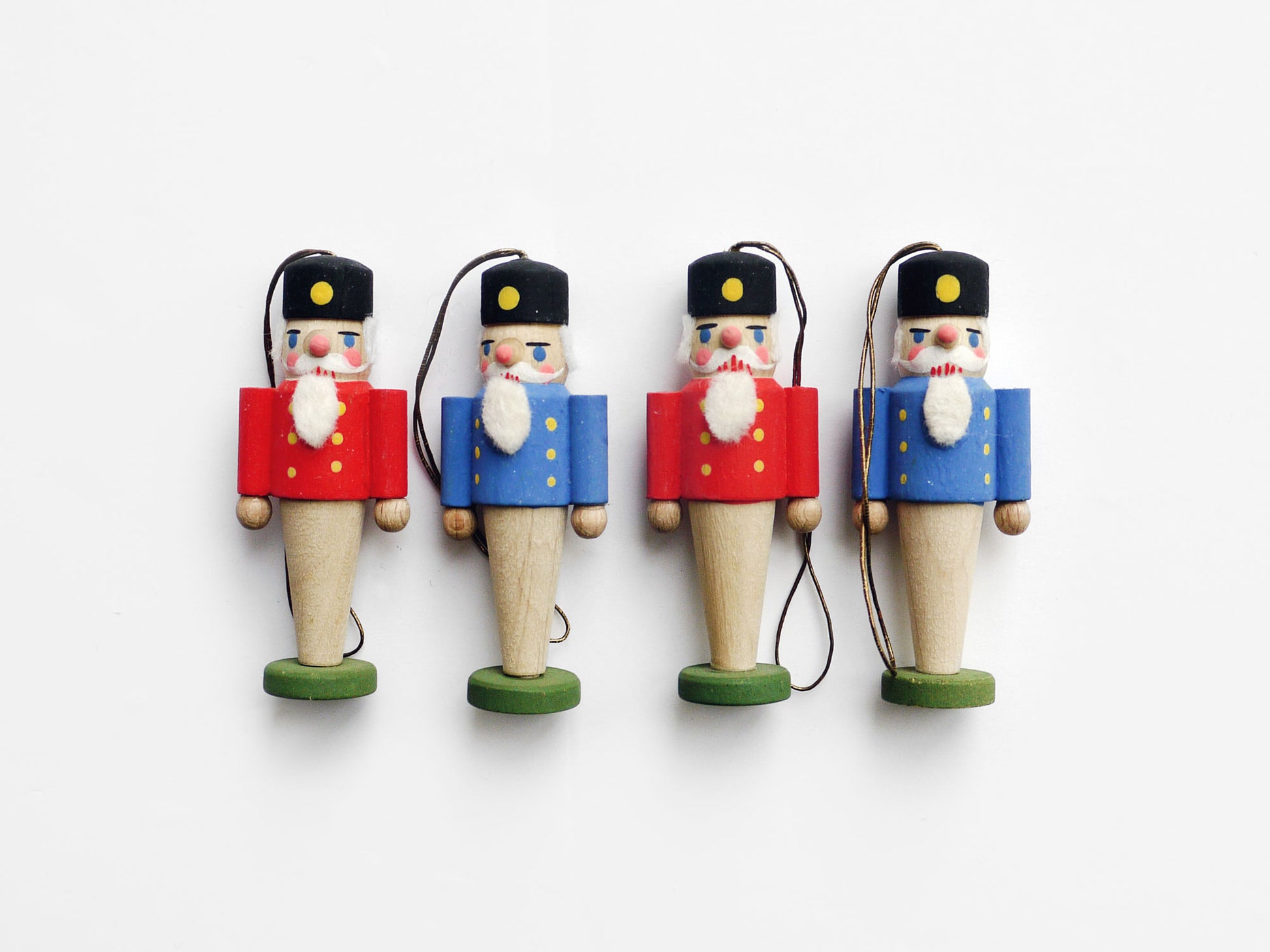 An original vintage product, but new condition, these Nutcracker soldiers are made of a light wood with a hint of felt (the beard!) these are a special tree ornament which are painted in solid, matt colours and hung with a gold thread. 57mm.