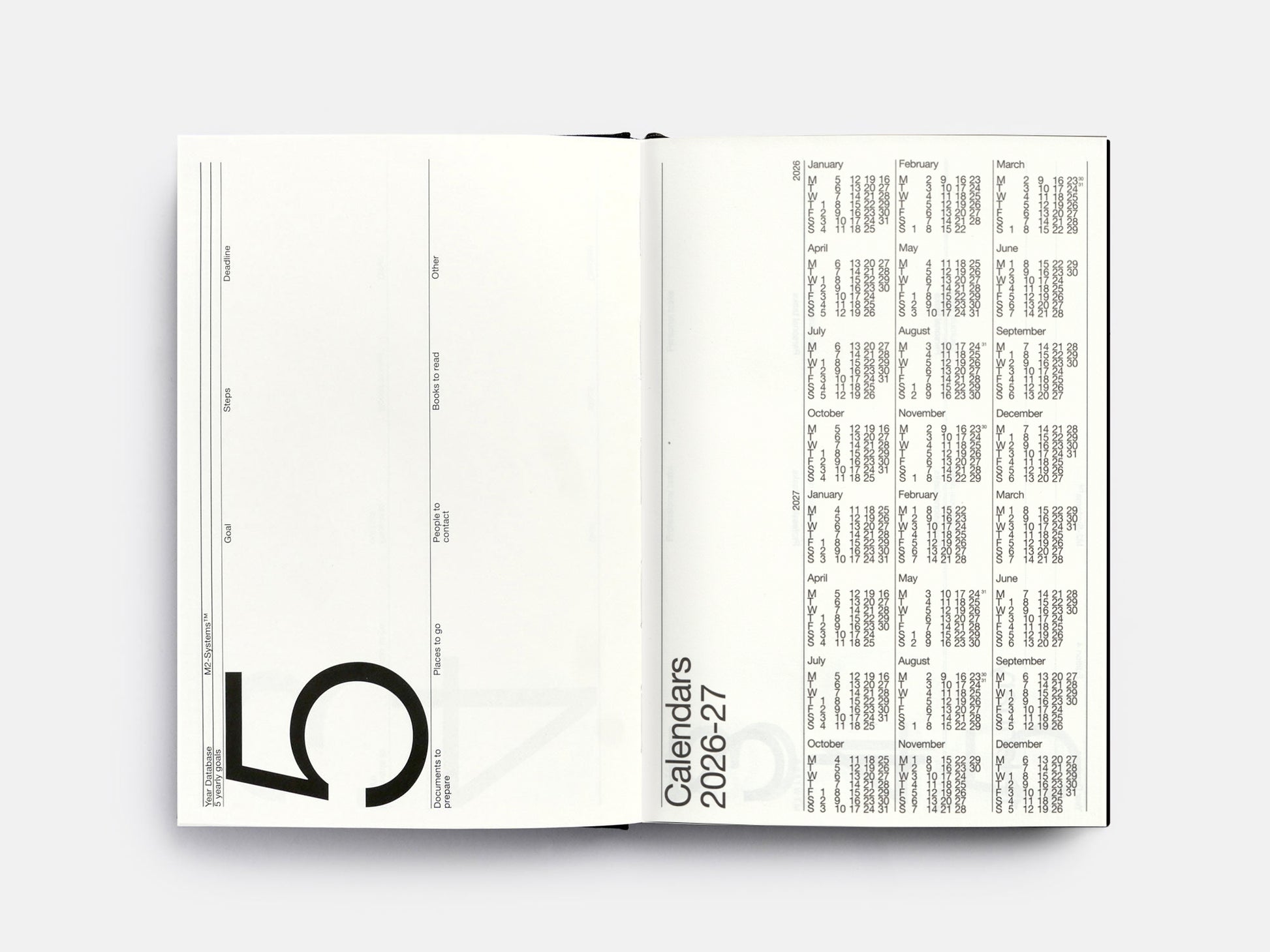 A diary for designers if ever there was one! Hardback, linen bound year planner laid out beautifully on crisp, off white paper (100gsm). The book has 2026/2027 calendars followed by undated week pages. In this the planner is perpetual, as you highlight the appropriate day of the week.